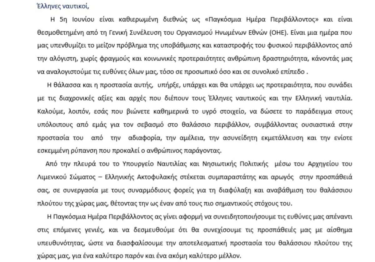 Το μήνυμα του Υπουργού Ναυτιλίας και Νησιωτικής Πολιτικής για την Παγκόσμια Ημέρα Περιβάλλοντος ΛΑΣΙΘΙ ΙΕΡΑΠΕΤΡΑ 1:30 μ.μ. - Τρίτη 2 Ιουνίου 2020 01:06 μ.μ. - Τρί, 02/30/2020 ΠΛΑΚΙΩΤΑΚΗΣ, ΠΑΓΚΟΣΜΙΑ ΗΜΕΡΑ ΠΕΡΙΒΑΛΛΟΝΤΟΣ Ευαισθητοποίηση του πολίτη σε θέματα προστασίας θαλασσίου περιβάλλοντος Το μήνυμα του κ. Υπουργού Ναυτιλίας και Νησιωτικής Πολιτικής κ. Ιωάννη Πλακιωτάκη ενόψει εορτασμού της Παγκόσμιας Ημέρας Περιβάλλοντος την 5η Ιουνίου 2020
