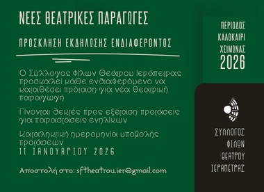 ΙΕΡΑΠΕΤΡΑ ΕΡΓΑ, ΣΥΛΛΟΓΟΣ ΦΙΛΩΝ ΘΕΑΤΡΟΥ, ΠΑΡΑΓΩΓΗ Ανοιχτό Κάλεσμα για Νέες Θεατρικές Παραγωγές στην Ιεράπετρα 08:09 π.μ. - 03/12/2025