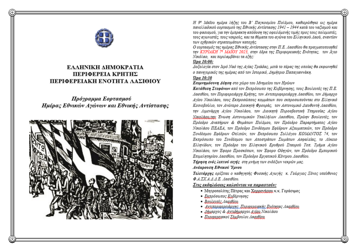 Σας προσκαλούμε να παρευρεθείτε στις εκδηλώσεις Εορτασμού της Επετείου των Εθνικών Αγώνων και της Εθνικής Αντίστασης κατά του ναζισμού και του φασισμού που θα πραγματοποιηθεί την Κυριακή 7 Μαΐου 2023 στις 10:00 στον Ιερό Ναό της Αγίας Τριάδας Αγίου Νικολάου, σύμφωνα με το επισυναπτόμενο πρόγραμμα.