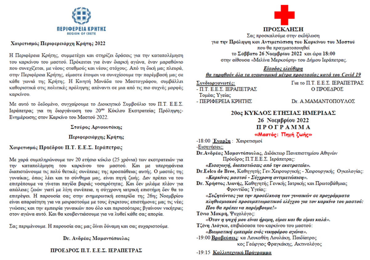 Το Σάββατο η εκδήλωση του Ερυθρού Σταυρού για τον καρκίνο του μαστού στην Ιεράπετρα ΛΑΣΙΘΙ ΙΕΡΑΠΕΤΡΑ 11:07 π.μ. - Τετάρτη 23 Νοεμβρίου 2022 11:11 π.μ. - Τετ, 23/07/2022 ΕΡΥΘΡΟΣ ΣΤΑΥΡΟΣ, ΕΚΣΤΡΑΤΕΙΑ ΠΡΟΛΗΨΗΣ ΚΑΡΚΙΝΟΥ ΤΟΥ ΜΑΣΤΟΥ, ΜΑΣΤΟΣ Στις 18:00 το απόγευμα στην αίθουσα «Μελίνα Μερκούρη» του Δήμου Ιεράπετρας - Αναλυτικά το πρόγραμμα της εκδήλωσης