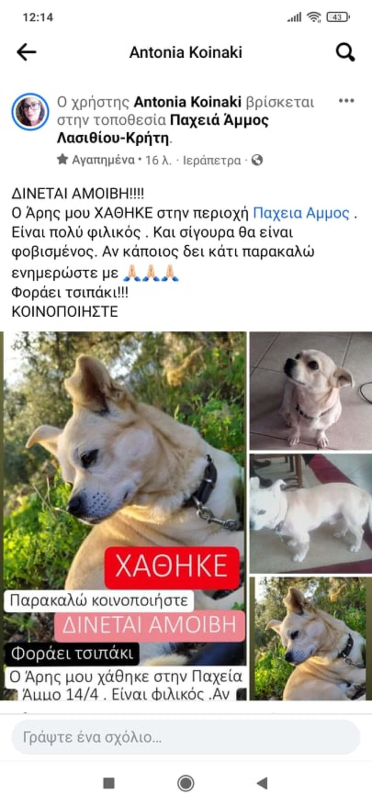 Χάθηκε ο Άρης! Μπορείτε να βοηθήσετε; ΛΑΣΙΘΙ ΙΕΡΑΠΕΤΡΑ 3:33 μ.μ. - Κυριακή 17 Απριλίου 2022 03:04 μ.μ. - Κυρ, 17/33/2022 ΠΑΧΕΙΑ ΑΜΜΟΣ, ΣΚΥΛΙ Από 14 Απρίλιου στην Παχειά Άμμο - Τον αναζητούν οι ιδιοκτήτες του