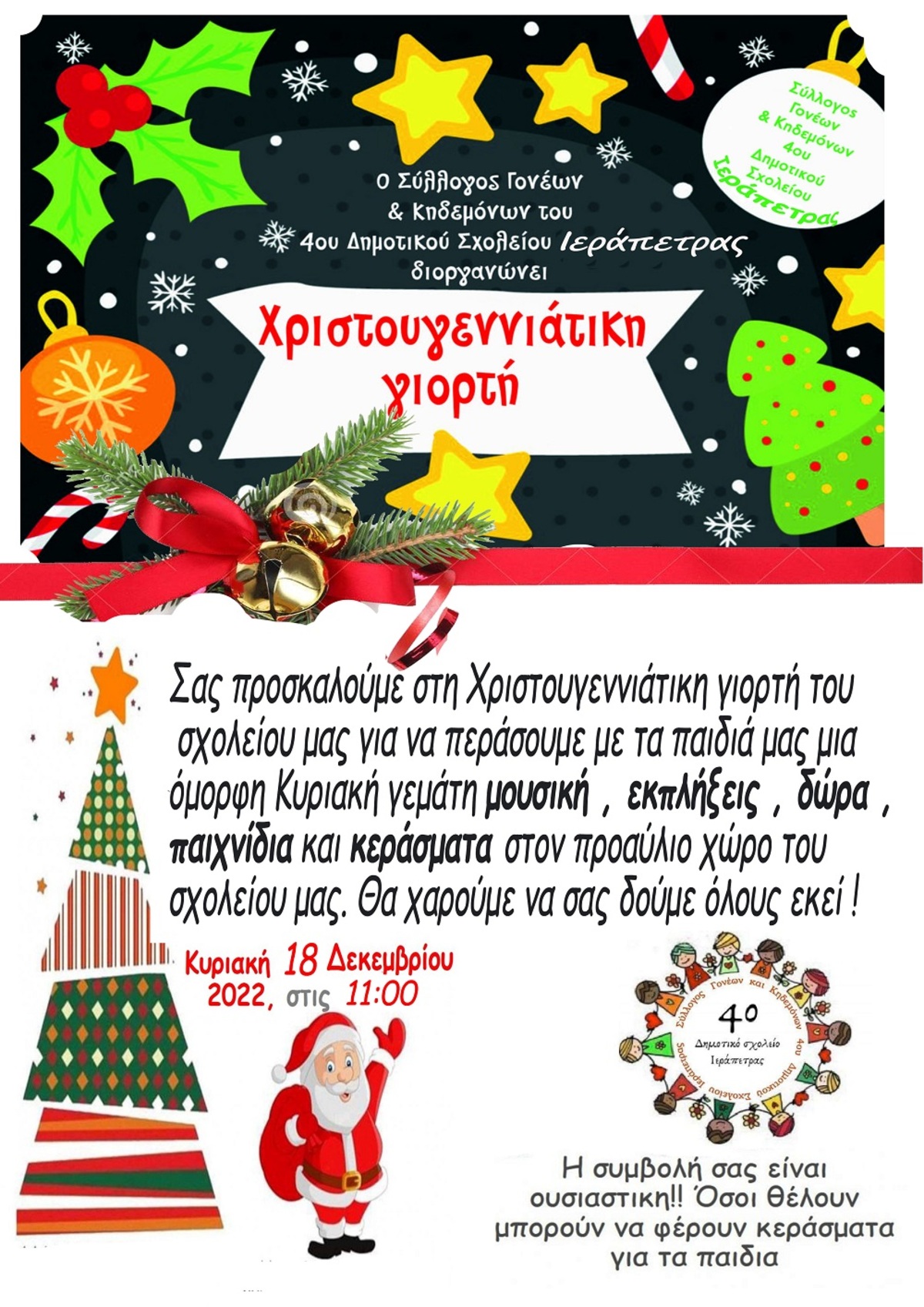Ο Σύλλογος Γονέων και Κηδεμόνων του 4ου δημοτικού Σχολείου Ιεράπετρας σας προσκαλεί με ιδιαίτερη χαρά στην Χριστουγεννιάτικη εκδήλωση πού διοργανώνει την ερχόμενη Κυριακή 18/12/2022, στις 11 το πρωί στον προαύλιο χώρο του σχολείου.Χειροτεχνίες, μουσική, κατασκευές, παιχνίδι, κεράσματα, δώρα, εκπλήξεις και φυσικά ο Άγιος Βασίλης σας περιμένουν να περάσουμε όλοι μαζί μια αξέχαστη γιορτή.