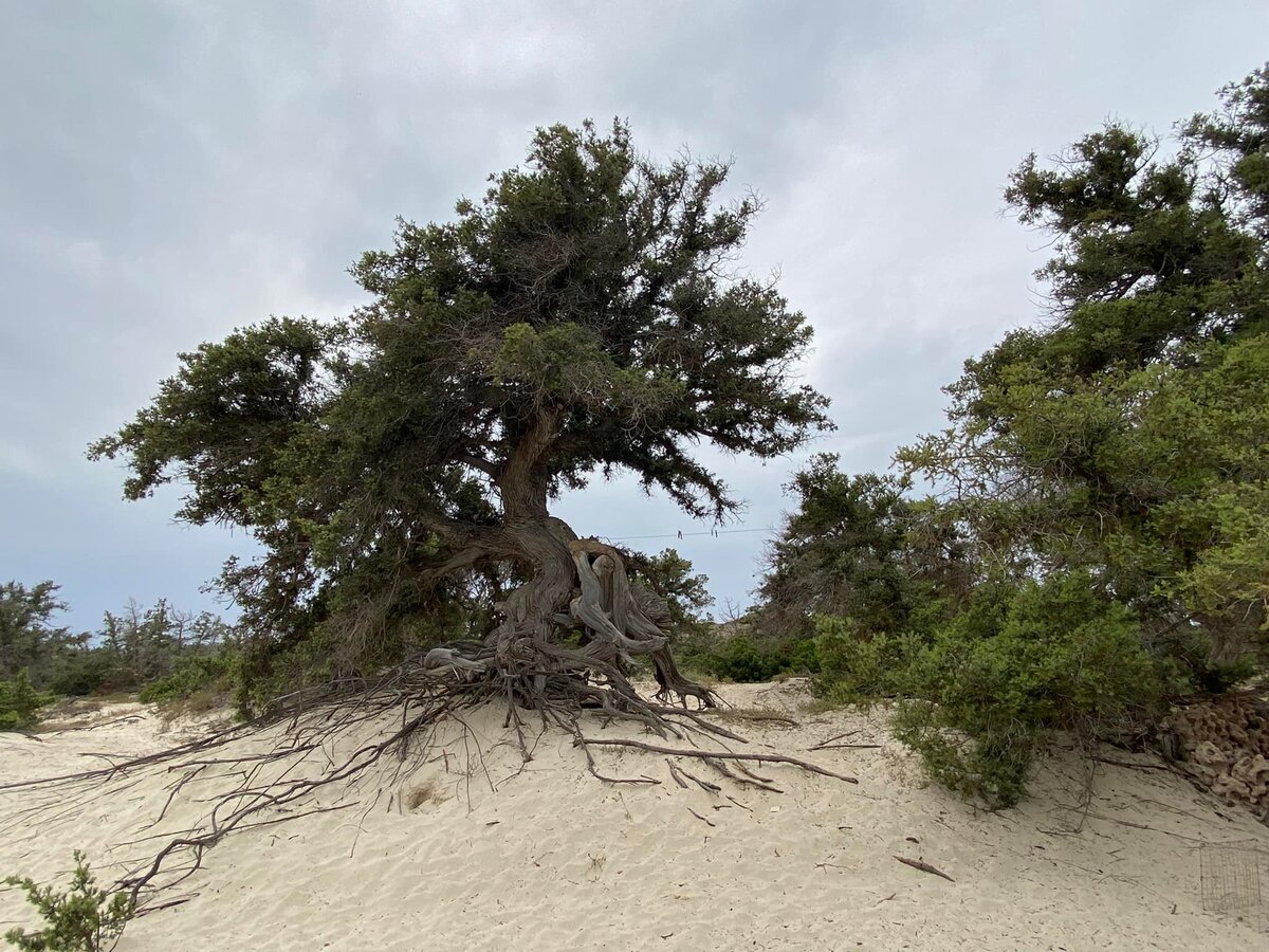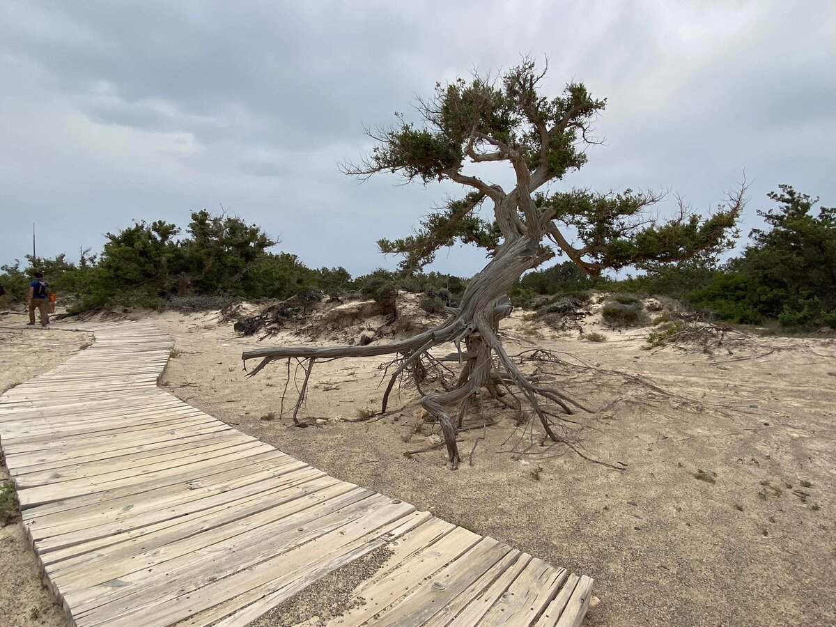 Οδυνηρή διαπίστωση είναι η ύπαρξη δικτύου δρόμων (μονοπατιών) πολλών χιλιομέτρων, οι οποίοι διατρέχουν όλη την έκταση και έχουν προκαλέσει εμφανή & ανεπανόρθωτη ζημιά στο ριζικό σύστημα των κέδρων. Ακόμα και σήμερα, υπάρχουν ίχνη από ρόδες σε αυτά τα μονοπάτια… Οι ξύλινοι διάδρομοι του προγράμματος Med. JuniCoast έχουν καταστραφεί και πρόκειται να απομακρυνθούν καθώς, από του χρόνου, θα υπάρχει διαφορετική προσέγγιση για τη μετακίνηση πάνω στο νησί με σκοπό να ανακάμψουν οι αμμοθίνες.