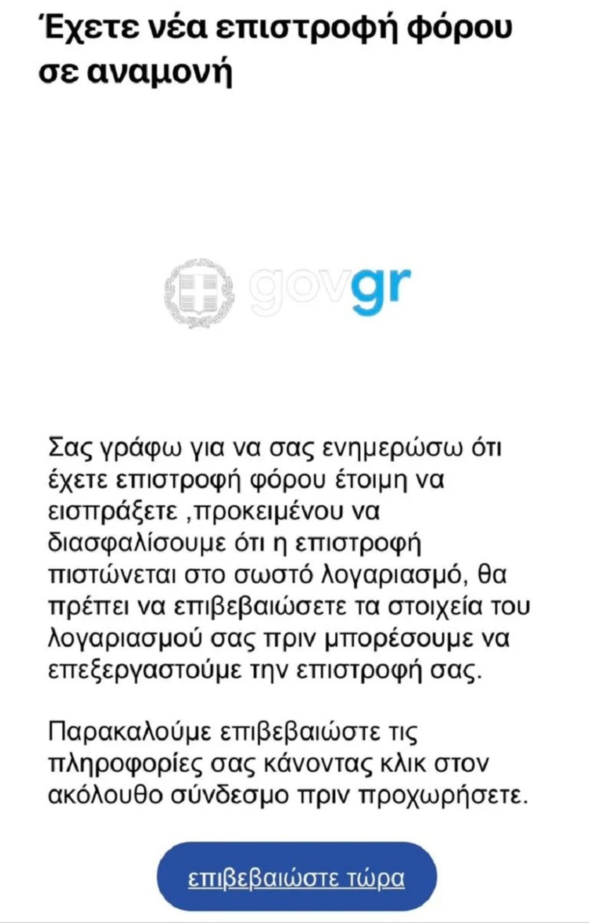 Το μήνυμα αναφέρει: «Σας γράφω για να σας ενημερώσω ότι η Ελληνική Φορολογική Υπηρεσία υπολόγισε τη φορολογική σας δήλωση και δικαιούστε επιστροφή φόρου ύψους 600,13 ευρώ. Για να διασφαλίσουμε ότι η επιστροφή πιστώνεται στο σωστό λογαριασμό, πρέπει πρώτα να επικυρώσουμε τα στοιχεία του λογαριασμού σας προτού μπορέσουμε να επεξεργαστούμε την επιστροφή σας. Για να γίνει αυτό, παρακαλούμε κάντε κλικ στον παρακάτω σύνδεσμο και επιβεβαιώστε τα στοιχεία σας».