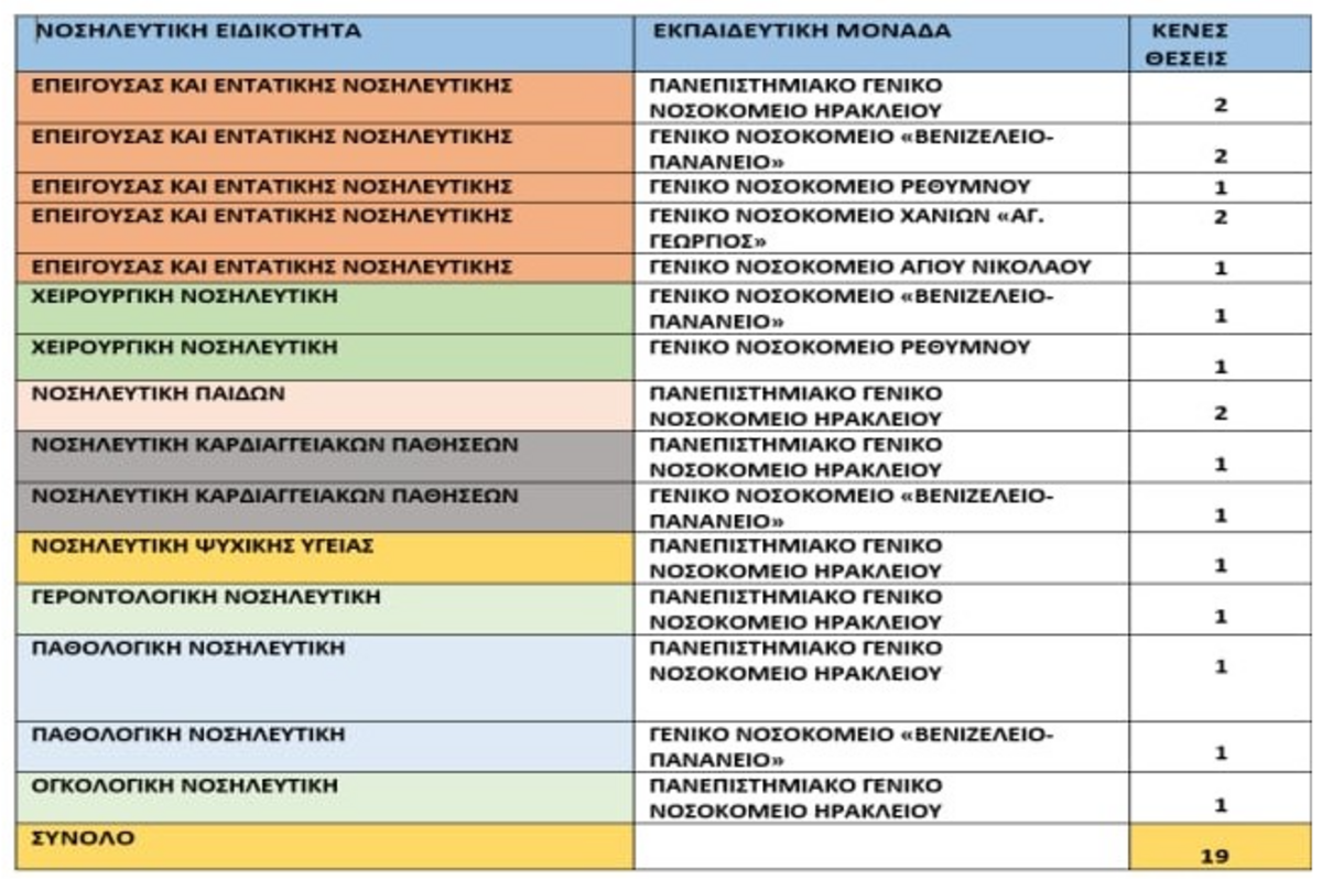 Η 7η Υγειονομική Περιφέρεια Κρήτης ανακοινώνει την πρόσκληση για την κάλυψη 19 θέσεων ειδικευόμενων νοσηλευτών για τις νοσηλευτικές ειδικότητες α) Επείγουσας και Εντατικής Νοσηλευτικής, β) Χειρουργικής Νοσηλευτικής, γ) Νοσηλευτική Ψυχικής Υγείας δ) Γεροντολογική Νοσηλευτικής ε) Παθολογικής Νοσηλευτικής, στ) Ογκολογικής Νοσηλευτικής, ζ) Νοσηλευτική Παίδων και η) Καρδιαγγειακών Παθήσεων. Οι θέσεις ανά νοσηλευτική ειδικότητα και εκπαιδευτική μονάδα έχουν ως ακολούθως :