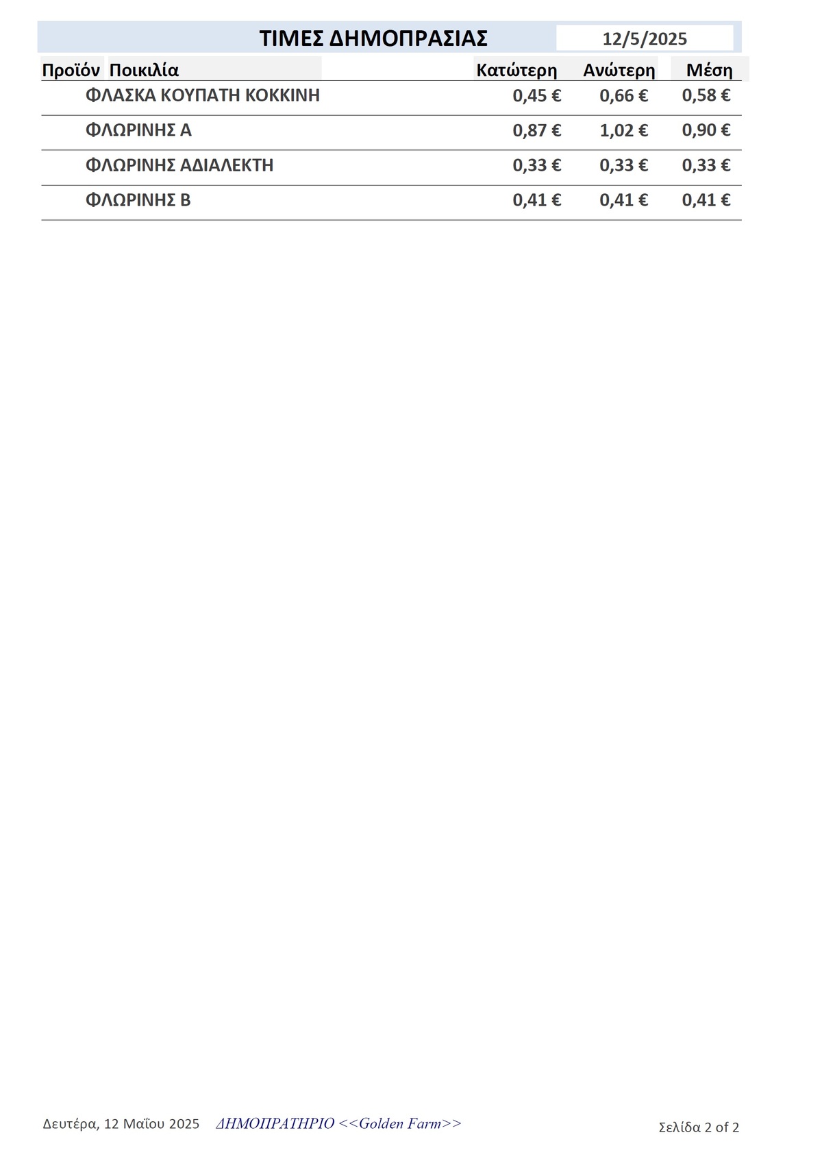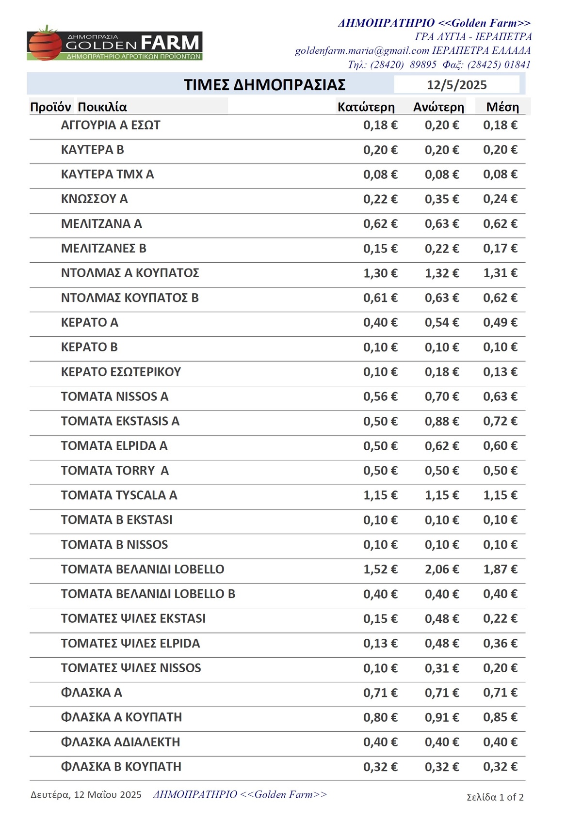 Τιμές Αγροτικών Προϊόντων 12.05.2025 ΤΙΜΕΣ 4:22 μ.μ. - Δευτέρα 12 Μαΐου 2025 04:05 μ.μ. - Δευ, 12/22/2025 ΙΕΡΑΠΕΤΡΑ, ΤΙΜΕΣ ΑΓΡΟΤΙΚΩΝ ΠΡΟΙΟΝΤΩΝ, ΔΗΜΟΠΡΑΤΗΡΙΟ, ΚΗΠΕΥΤΙΚΑ , GOLDEN FARM Δείτε τις σημερινές τιμές του δημοπρατηρίου