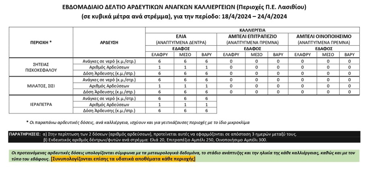 Το αρδευτικό δελτίο για την Π.Ε. Λασιθίου ΛΑΣΙΘΙ ΙΕΡΑΠΕΤΡΑ 11:00 π.μ. - Πέμπτη 18 Απριλίου 2024 11:04 π.μ. - Πέμ, 18/00/2024 ΛΑΣΙΘΙ, ΔΕΛΤΙΟ ΑΡΔΕΥΣΗΣ Από 18.04 έως 24.04.2024 Η Περιφέρεια Κρήτης σε συνεργασία με το Ινστιτούτο Ελιάς Υποτροπικών Φυτών & Αμπέλου του ΕΛΓΟ-ΔΗΜΗΤΡΑ κοινοποιεί το 2ο Ενημερωτικό Δελτίο Άρδευσης, για την περίοδο από 18/04 έως 24/04/2024.