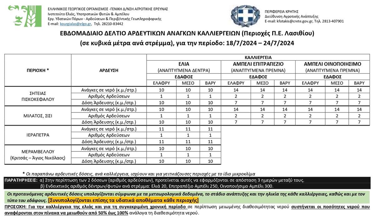 Το αρδευτικό δελτίο για την Π.Ε. Λασιθίου ΛΑΣΙΘΙ ΙΕΡΑΠΕΤΡΑ 10:58 π.μ. - Πέμπτη 18 Ιουλίου 2024 10:07 π.μ. - Πέμ, 18/58/2024 ΛΑΣΙΘΙ, ΔΕΛΤΙΟ ΑΡΔΕΥΣΗΣ Από 18/07 έως 24/07/2024 Η Περιφέρεια Κρήτης σε συνεργασία με το Ινστιτούτο Ελιάς Υποτροπικών Φυτών & Αμπέλου του ΕΛΓΟ-ΔΗΜΗΤΡΑ κοινοποιεί το 15ο Ενημερωτικό Δελτίο Άρδευσης, για την περίοδο από 18/07 έως 24/07/2024.
