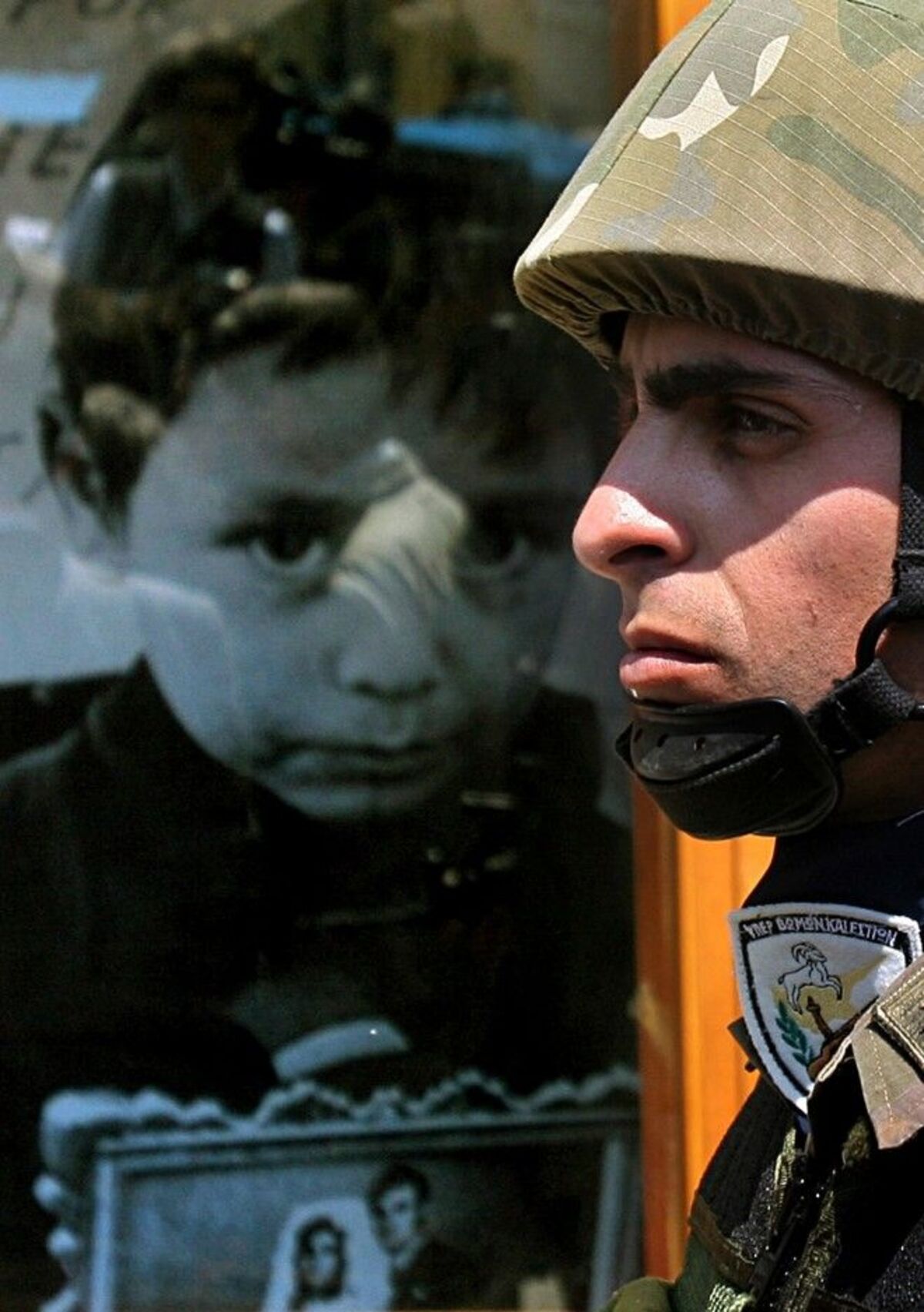 A Greek Cypriot soldier stands at a guardhouse in front of a poster depicting a Greek Cypriot boy holding a picture his parents who are allegedly missing since the 1974 Turkish invasion, next to the UN buffer zone (Green Line) that divides the Greek and Turkish Cypriot controlled areas in central divided capital of Nicosia, Cyprus, on Thursday, April 6, 2006. (AP Photo/Petros Karadjias) AP