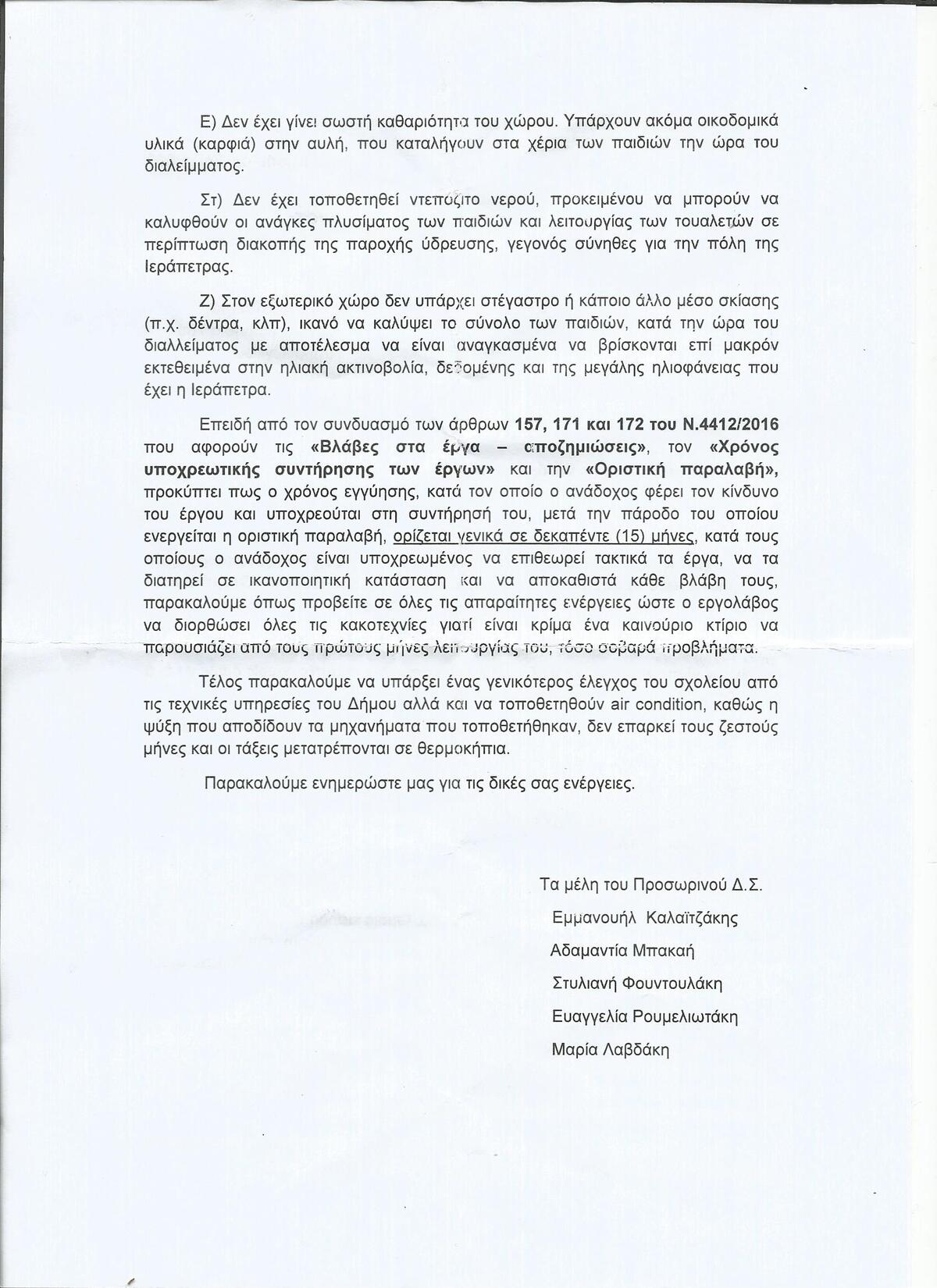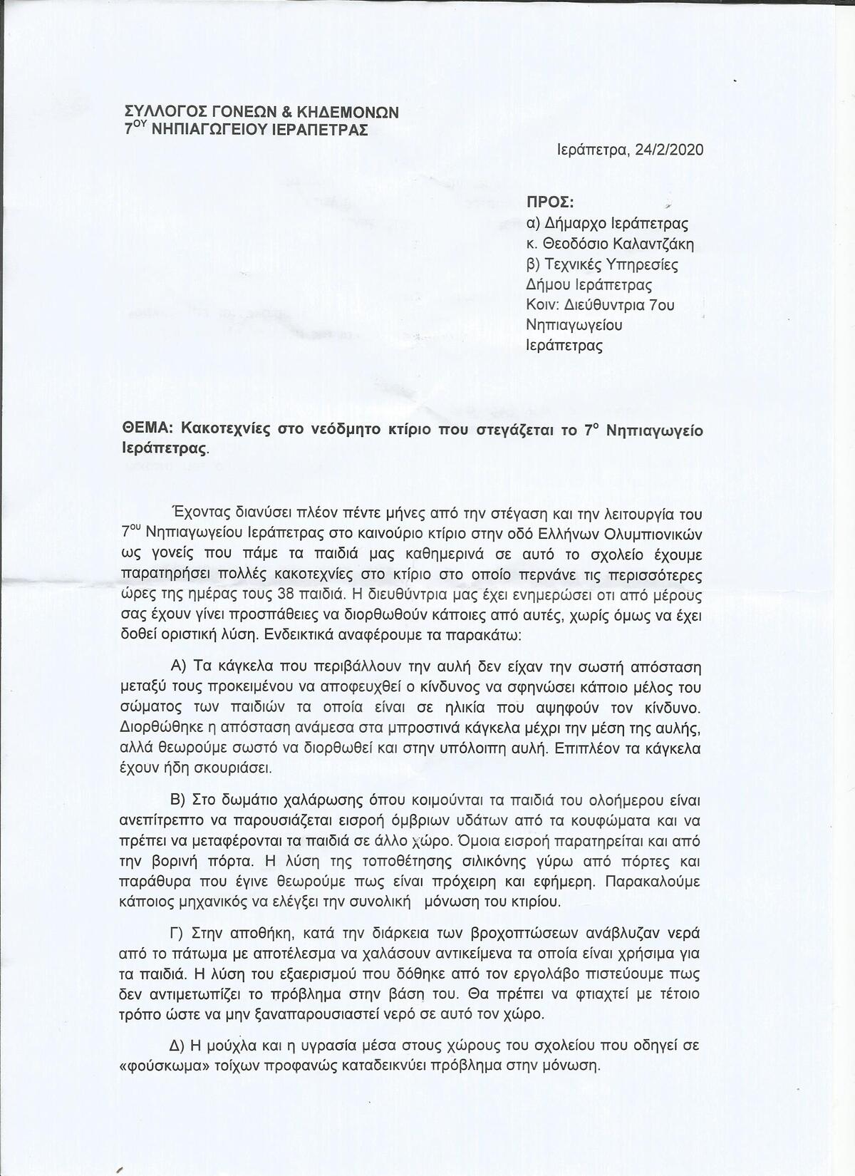 Για κακοτεχνίες στο νεόδμητο κτίριο που στεγάζεται το 7ο Νηπιαγωγείο Ιεράπετρας τα εγκαίνια του οποίου πραγματοποιήθηκαν σήμερα κάνουν λόγο τα μέλη του προσωρινού Δ.Σ. του συλλόγου γονέων και κηδεμόνων του σχολείου. Στέλνουν μάλιστα επιστολή προς τον Δήμαρχο κ. Θεοδόση Καλαντζάκη και τις τεχνικές υπηρεσίες του δήμου κοινοποιώντας την προς τη Διευθύντρια ενημερώνοντας τους για τα προβλήματα που έχουν καταγράψει κατά τους πέντε μήνες λειτουργίας του σχολείου στο νέο κτίριο.