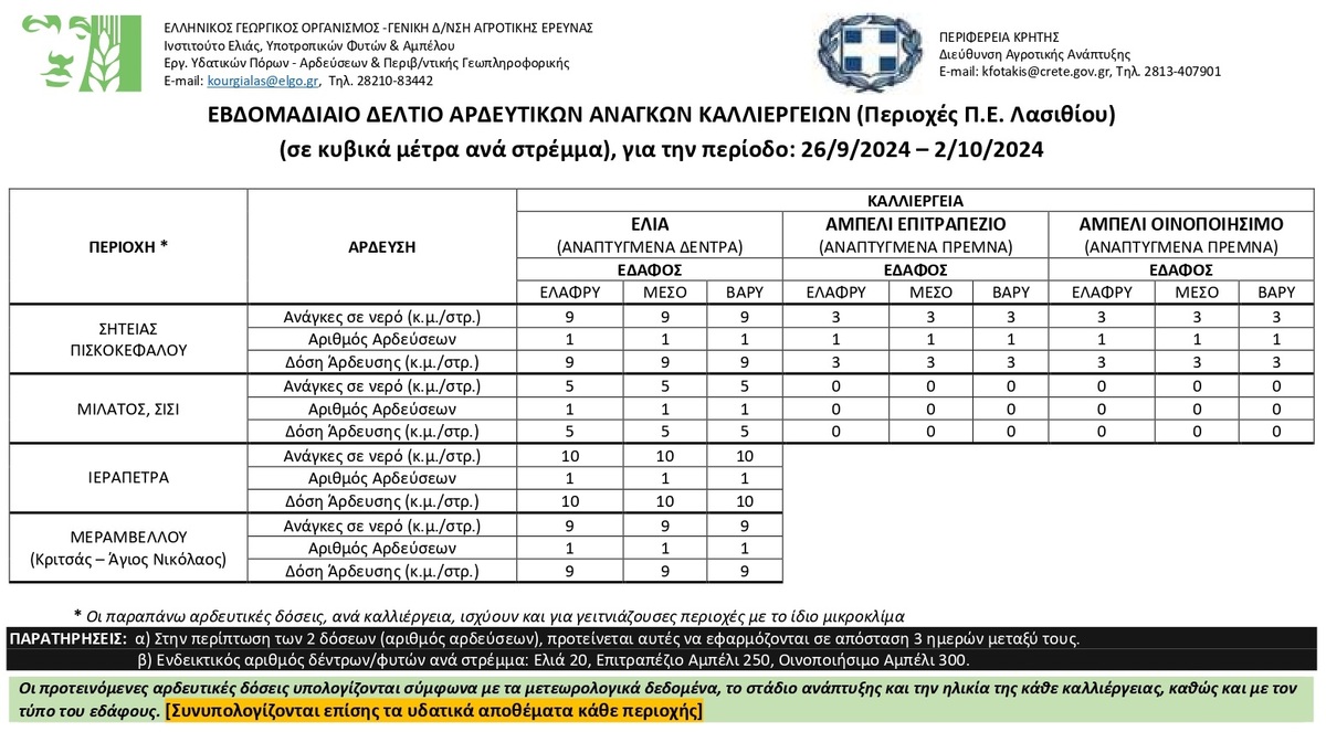 Το αρδευτικό δελτίο για την Π.Ε. Λασιθίου ΕΝΟΤΗΤΕΣ ΚΟΙΝΩΝΙΑ 11:54 π.μ. - Πέμπτη 26 Σεπτεμβρίου 2024 11:09 π.μ. - Πέμ, 26/54/2024 ΛΑΣΙΘΙ, ΔΕΛΤΙΟ ΑΡΔΕΥΣΗΣ Από 26/09 έως 02/10/2024 Η Περιφέρεια Κρήτης σε συνεργασία με το Ινστιτούτο Ελιάς Υποτροπικών Φυτών & Αμπέλου του ΕΛΓΟ-ΔΗΜΗΤΡΑ κοινοποιεί το 25ο Ενημερωτικό Δελτίο Άρδευσης, για την περίοδο από 26/09 έως 02/10/2024.