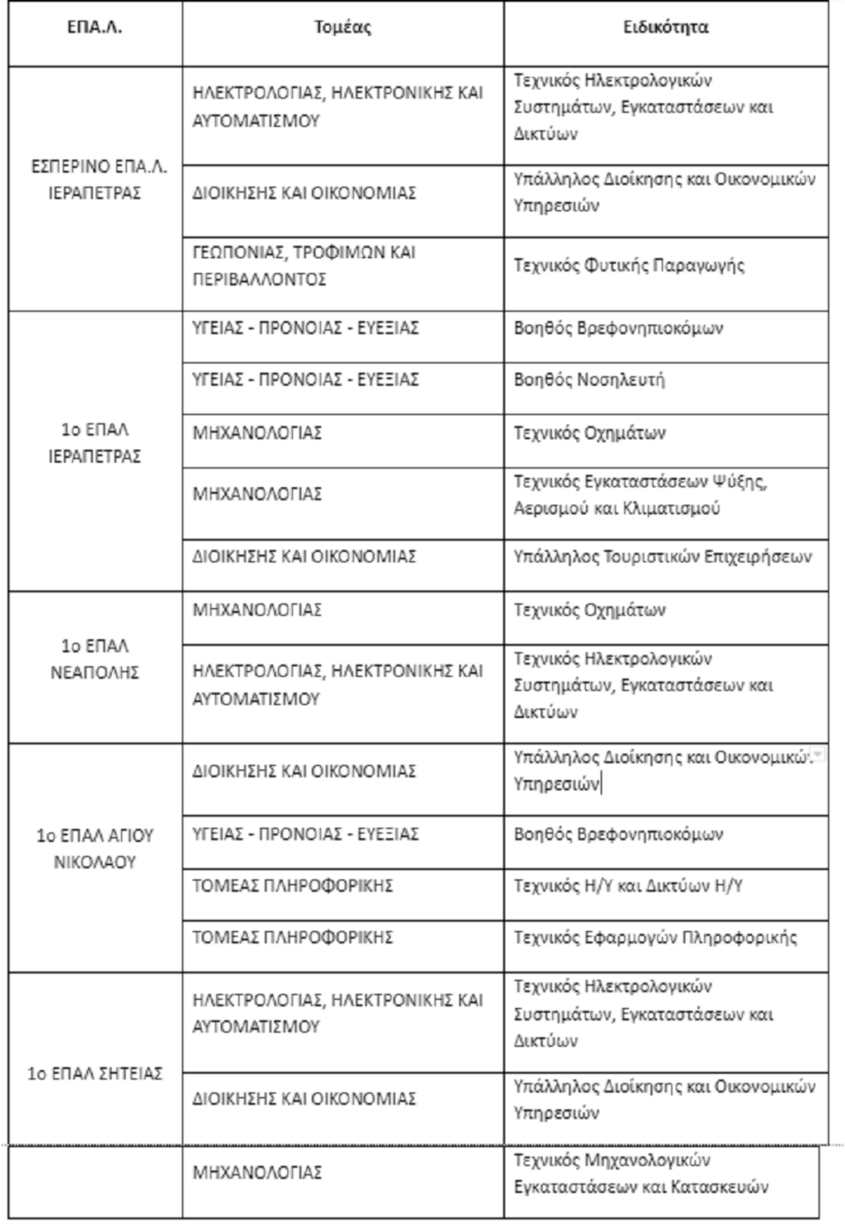 Τα τμήματα που μπορούν να υποβάλουν αίτηση οι υποψήφιοι στο νομό Λασιθίου φαίνονται στον παρακάτω πίνακα.