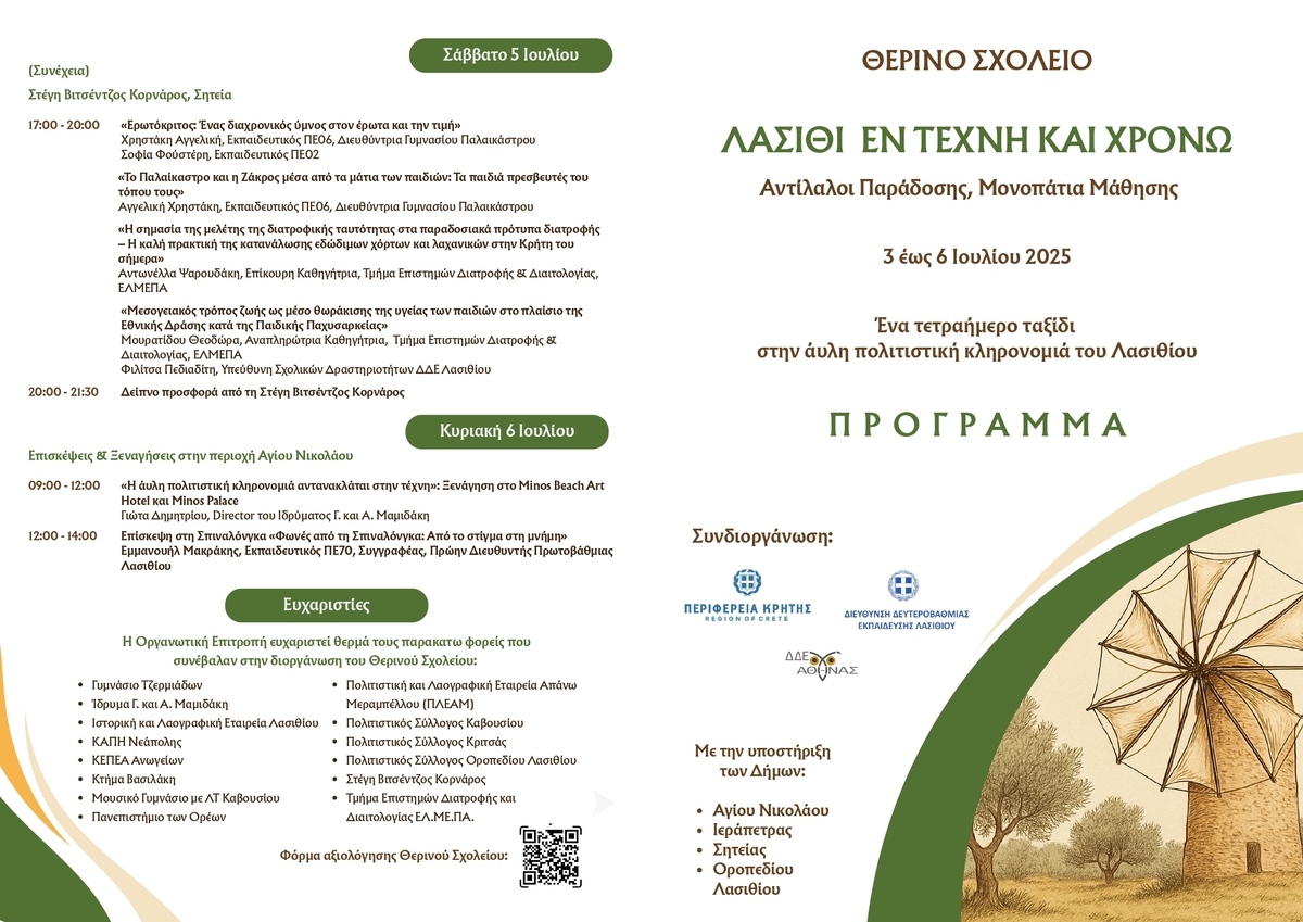 Θερινό Σχολείο: Λασίθι εν τέχνη και χρόνω | 3 έως 6 Ιουλίου 2025 ΛΑΣΙΘΙ ΙΕΡΑΠΕΤΡΑ 12:38 μ.μ. - Τετάρτη 25 Ιουνίου 2025 12:06 μ.μ. - Τετ, 25/38/2025 ΛΑΣΙΘΙ, ΘΕΡΙΝΟ ΣΧΟΛΕΙΟ, ΔΔΕ ΛΑΣΙΘΙΟΥ Ένα τετραήμερο ταξίδι στην άυλη πολιτιστική κληρονομιά του Λασιθίου