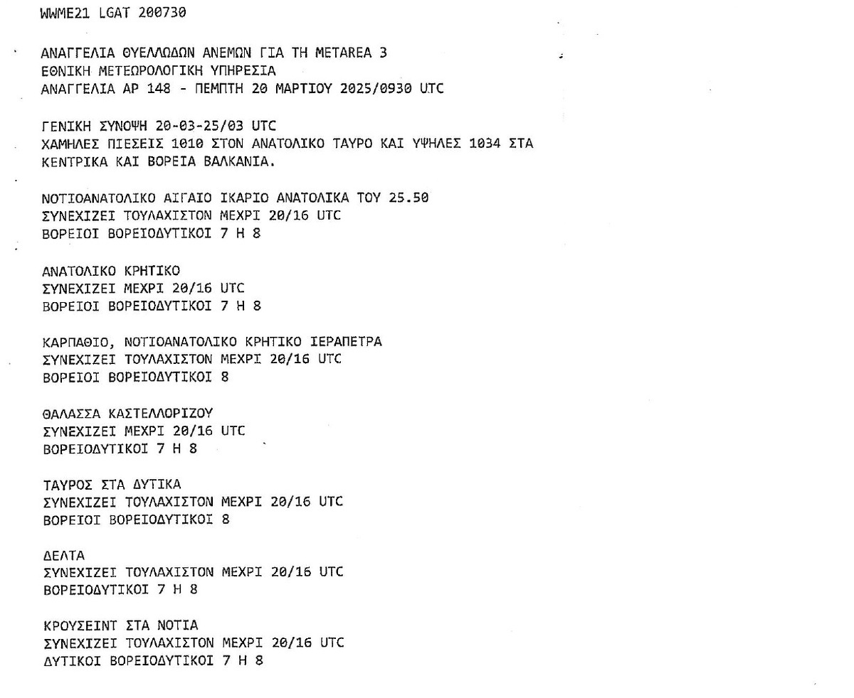 Σας ενημερώνουμε ότι σύμφωνα με το από 20.03.2025 έκτακτο δελτίο αναγγελίας θυελλωδών ανέμων που εκδόθηκε από την Ε.Μ.Υ σήμερα στο Νοτιοανατολικό Κρητικό Ιεράπετρα, Καρπάθιο θα πνέουν άνεμοι βόρειοι βορειοδυτικοί 8 μποφόρ.
