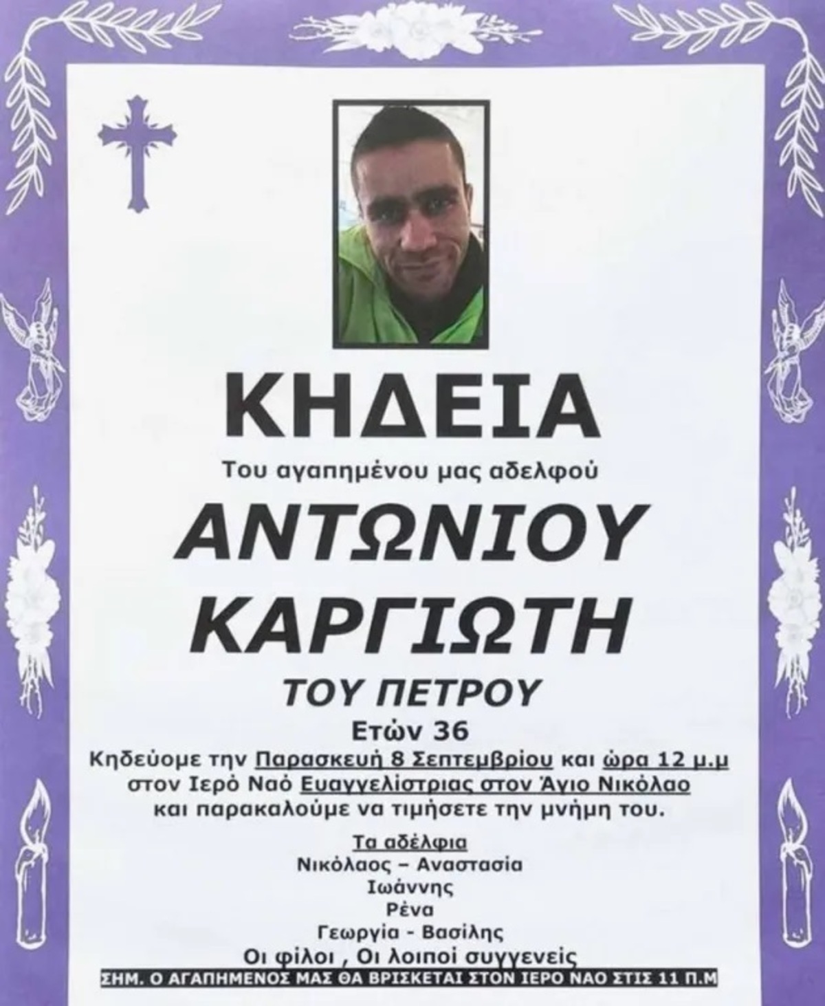 Στο πένθος έχει βυθιστεί η τοπική κοινωνία του Αγίου Νικολάου, μετά τον άδικο χαμό του 36χρονου Αντώνη Καργιώτη που έχει συγκλονίσει το πανελλήνιο.