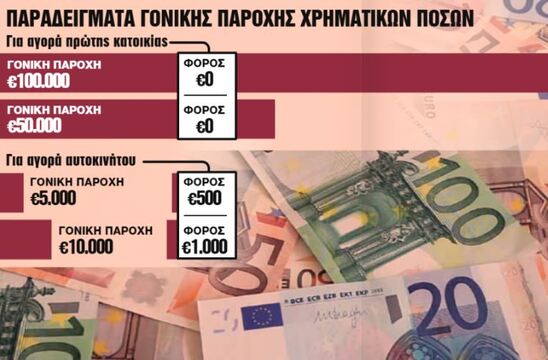 Τα τεκμήρια διαβίωσης και απόκτησης περιουσιακών στοιχείων αθροίζονται και οι φορολογούμενοι θα πρέπει να εμφανίσουν υψηλότερα εισοδήματα για να μην εγκλωβιστούν σε αυτά. Εάν οι γονείς δώσουν χρήματα στα παιδιά τους για να αγοράσουν ένα αυτοκίνητο τότε η γονική παροχή του χρηματικού ποσού φορολογείται με συντελεστή 10% και μάλιστα από το πρώτο ευρώ. Εάν όμως τα παιδιά αποκτήσουν πρώτη κατοικία με «προίκα» ο φόρος μηδενίζεται για ποσά έως 150.000 ευρώ. Ετσι, στην περίπτωση που ο πατέρας δώσει στην κόρη του το ποσό των 5.000 ευρώ για την αγορά ενός αυτοκινήτου, τότε η συγκεκριμένη γονική παροχή θα επιβαρυνθεί με φόρο 500 ευρώ (5.000×10%). Αν όμως ο πατέρας βοηθήσει την κόρη του για να αγοράσει πρώτη κατοικία δίνοντάς της 50.000 ευρώ δεν θα επιβαρυνθεί ούτε με ένα ευρώ.