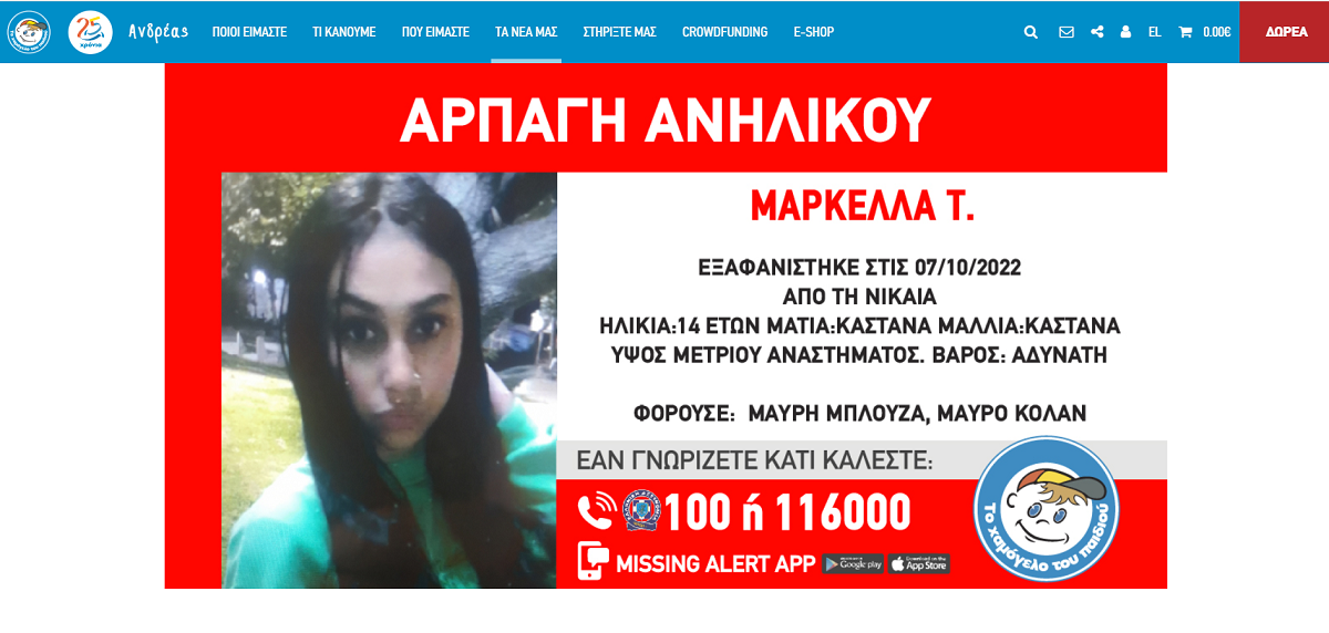 Την επόμενη μέρα οι γονείς της ειδοποίησαν την αστυνομία και το «Χαμόγελο του Παιδιού» το οποίο μάλιστα δημοσιοποίησε φωτογραφία του κοριτσιού.