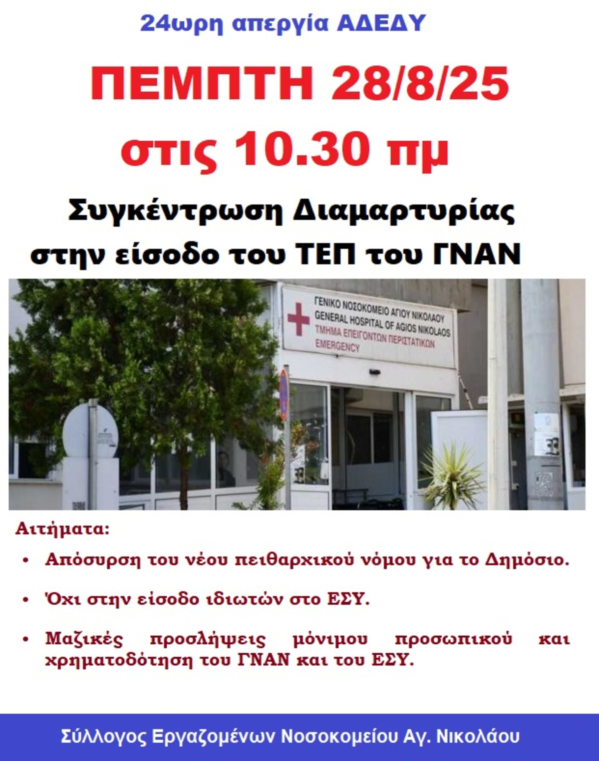 -Συγκέντρωση στην είσοδο του ΤΕΠ ΓΝΑΝ την Πέμπτη 28/8/25 στις 10.30 πμ με αιτήματα: