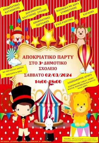 Ο Σύλλογος Γονέων & Κηδεμόνων του 3ου Δημοτικού Σχολείου Ιεράπετρας σας προσκαλεί στο αποκριάτικο party του σχολείου το Σάββατο 02.03.2024 από τις 14:00 έως τις 18:00. Το party περιλαμβάνει αποκριάτικες κατασκευές, διαγωνισμό καλύτερης στολής, αποκριάτικες ζωγραφιές, παιχνίδια με δώρα συμμετοχής, face painting και καραόκε. Επίσης, θα πραγματοποιηθεί λαχειοφόρος αγορά με κλήρωση tablet, smart watch, power bank και πολλά άλλα δώρα. Είσοδος 2 ευρώ με δωρεάν pop corn και νερό.