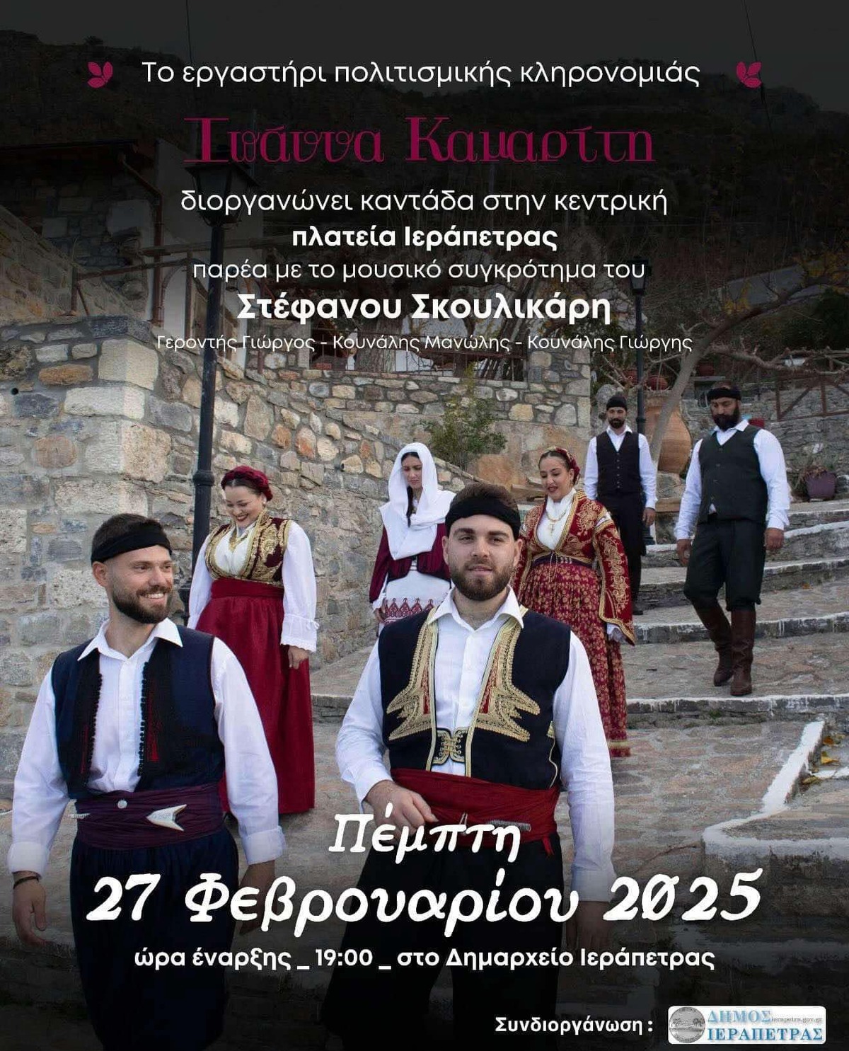 Παραδοσιακές καντάδες στους δρόμους της πόλης και κατάληξη στην κεντρική πλατεία με το εργαστήρι πολιτισμικής κληρονομιάς της Ιωάννας Καμαρίτη και το μουσικό συγκρότημα του Στέφανου Σκουλικάρη.