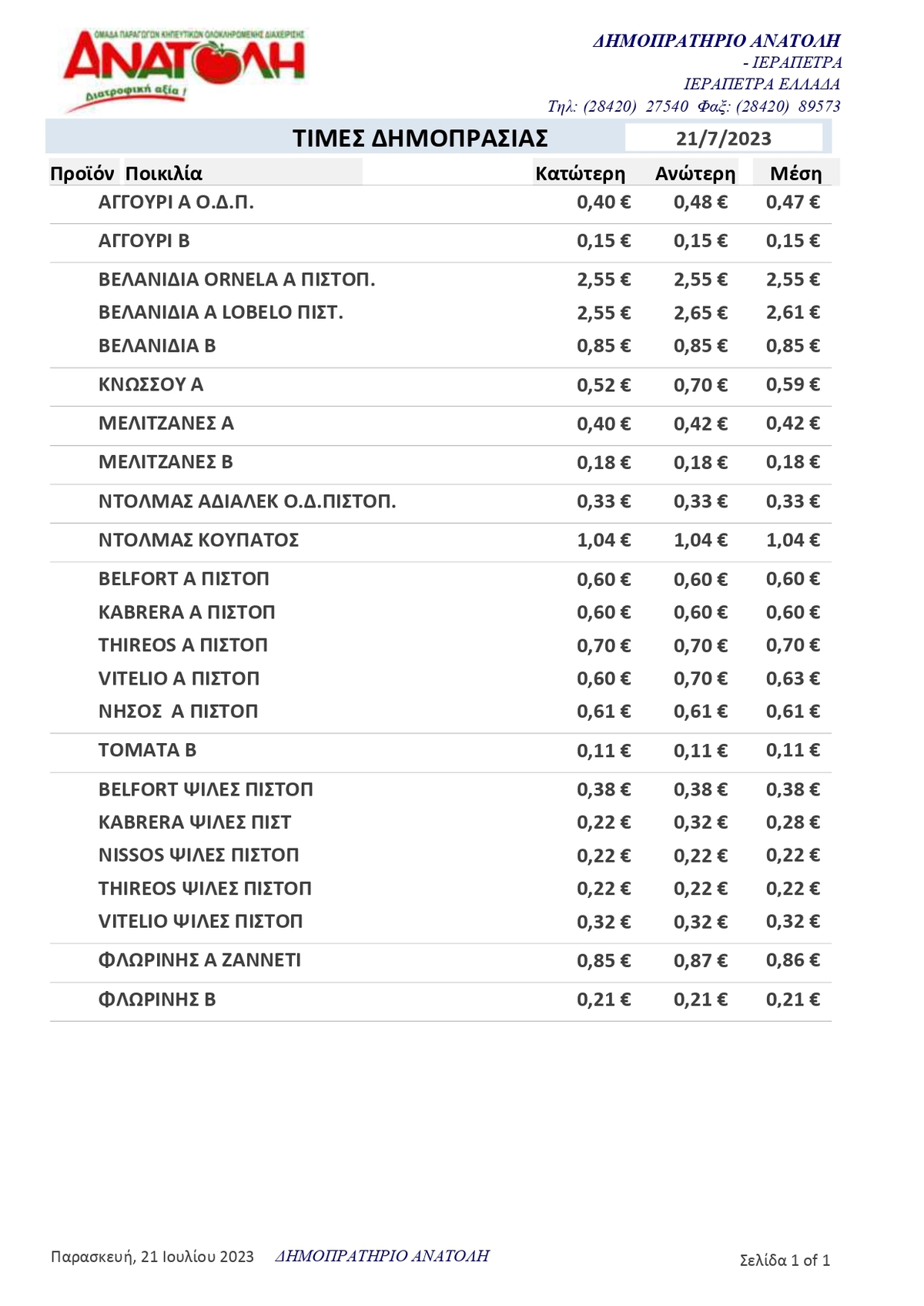 Α.Σ. ΑΝΑΤΟΛΗ | Τιμές Αγροτικών Προϊόντων 21-07-2023 ΤΙΜΕΣ 2:46 μ.μ. - Παρασκευή 21 Ιουλίου 2023 02:07 μ.μ. - Παρ, 21/46/2023 ΙΕΡΑΠΕΤΡΑ, ΤΙΜΕΣ ΑΓΡΟΤΙΚΩΝ ΠΡΟΙΟΝΤΩΝ , ΔΗΜΟΠΡΑΤΗΡΙΟ, ΚΗΠΕΥΤΙΚΑ , ΑΣ ΑΝΑΤΟΛΗ Οι τιμές του δημοπρατηρίου
