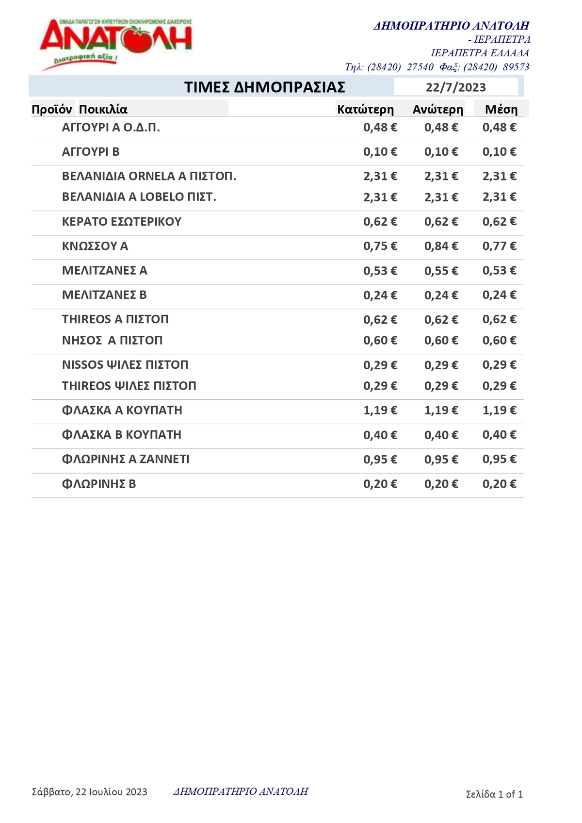 Α.Σ. ΑΝΑΤΟΛΗ | Τιμές Αγροτικών Προϊόντων 22-07-2023 ΤΙΜΕΣ 2:02 μ.μ. - Σάββατο 22 Ιουλίου 2023 02:07 μ.μ. - Σάβ, 22/02/2023 ΙΕΡΑΠΕΤΡΑ, ΤΙΜΕΣ ΑΓΡΟΤΙΚΩΝ ΠΡΟΙΟΝΤΩΝ , ΔΗΜΟΠΡΑΤΗΡΙΟ, ΚΗΠΕΥΤΙΚΑ ΠΡΟΙΟΝΤΑ, ΑΣ ΑΝΑΤΟΛΗ Οι τιμές του δημοπρατηρίου