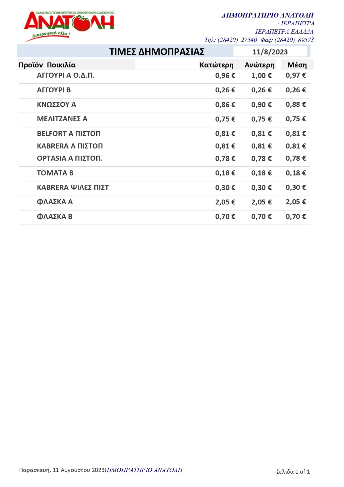 Α.Σ. ΑΝΑΤΟΛΗ - Τιμές Αγροτικών Προϊόντων 11-8-2023 ΤΙΜΕΣ 11:35 π.μ. - Παρασκευή, 11 Αυγούστου 2023 11:08 π.μ. - Παρ, 11/35/2023 ΙΕΡΑΠΕΤΡΑ, ΤΙΜΕΣ ΑΓΡΟΤΙΚΩΝ ΠΡΟΙΟΝΤΩΝ , ΔΗΜΟΠΡΑΤΗΡΙΟ, ΚΗΠΕΥΤΙΚΑ ΠΡΟΙΟΝΤΑ, ΑΣ ΑΝΑΤΟΛΗ Δείτε τις τιμές του δημοπρατηρίου