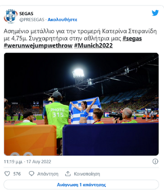 Άλλον ένα φοβερό αγώνα έκανε η Κατερίνα Στεφανίδη. Με την πρώτη προσπάθεια πέρασε πάνω (και) από τα 4,75 μ., κάνοντας ένα εκπληκτικό άλμα που της χάρισε την δεύτερη θέση στον τελικό του επί κοντώ, στο Ευρωπαϊκό Πρωτάθλημα στο Μόναχο.