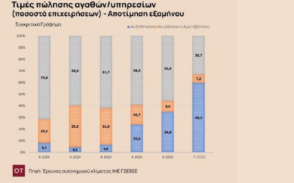 Με βάση τις έρευνες οικονομικού κλίματος του ΙΜΕ ΓΣΕΒΕΕ, οι επιχειρήσεις που δήλωσαν ότι αύξησαν τις τιμές τους διαρκώς αυξάνονται καθώς από 6,6% που ήταν το 2ο εξάμηνο του 2020, ανήλθαν στο 23,6% το 1ο εξάμηνο του 2021, στο 34,8% το 2ο εξάμηνο του 2021 και στο 59,2% το 1ο εξάμηνο του 2022.