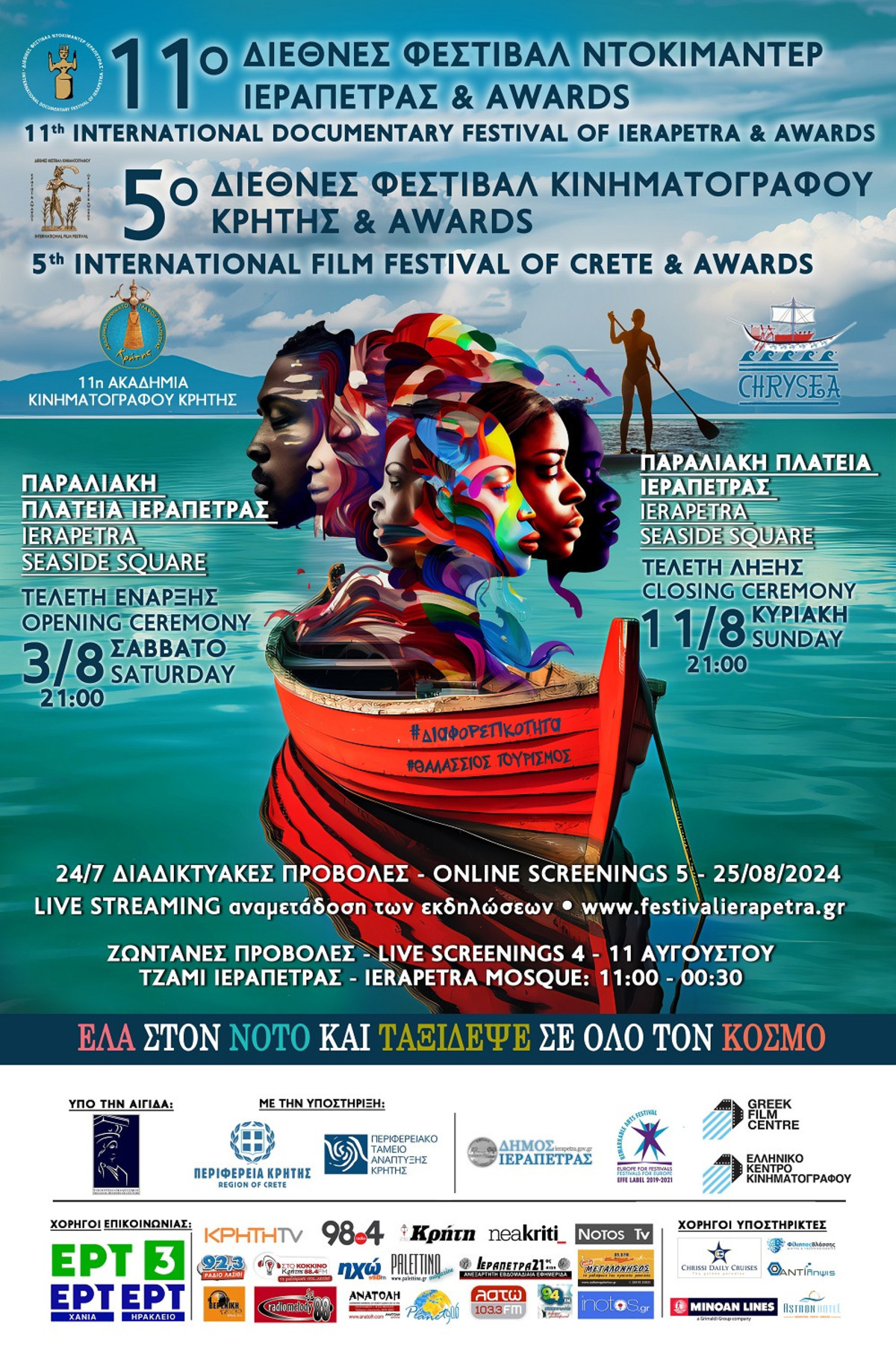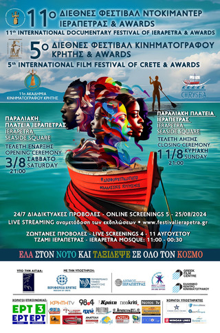 Με μεγάλη μου χαρά, σας προσκαλώ το Σάββατο 3 Αυγούστου στις 21:00 στην Παραλιακή Πλατεία Ιεράπετρας, στην Τελετή Έναρξης του «11ου Διεθνούς Φεστιβάλ Ντοκιμαντέρ Ιεράπετρας & Αwards», που φέτος είναι αφιερωμένο στην Διαφορετικότητα, αλλά και του «5ου Διεθνούς Φεστιβάλ Κινηματογράφου Κρήτης & Αwards», που φέτος είναι αφιερωμένο στον Θαλάσσιο Τουρισμό, κατά τη διάρκεια του οποίου θα υλοποιήσουμε σειρά θαλάσσιων δραστηριοτήτων στο παραλιακό μέτωπο της Ιεράπετρας. Ελάτε να γιορτάσουμε τα 11 χρόνια μας, με ένα φαντασμαγορικό μουσικοχορευτικό πρόγραμμα διεθνών και καταξιωμένων καλλιτεχνών. Η βραδιά θα κλείσει με την Τιμητική Προβολή της ταινίας «Τα παιδιά του δρόμου», που θα μας ταξιδέψει στα μονοπάτια της διαφορετικότητας και των ανθρωπίνων δικαιωμάτων.