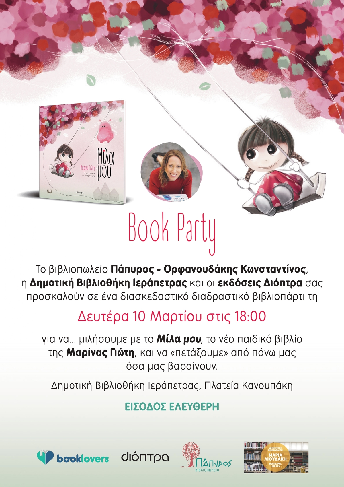 Το βιβλιοπωλείο Πάπυρος - Ορφανουδάκης Κωνσταντίνος, η Δημοτική Βιβλιοθήκη Ιεράπετρας και οι εκδόσεις Διόπτρα σας προσκαλούν σε ένα μοναδικό διαδραστικό Book Party τη Δευτέρα 10 Μαρτίου στις 18:00.