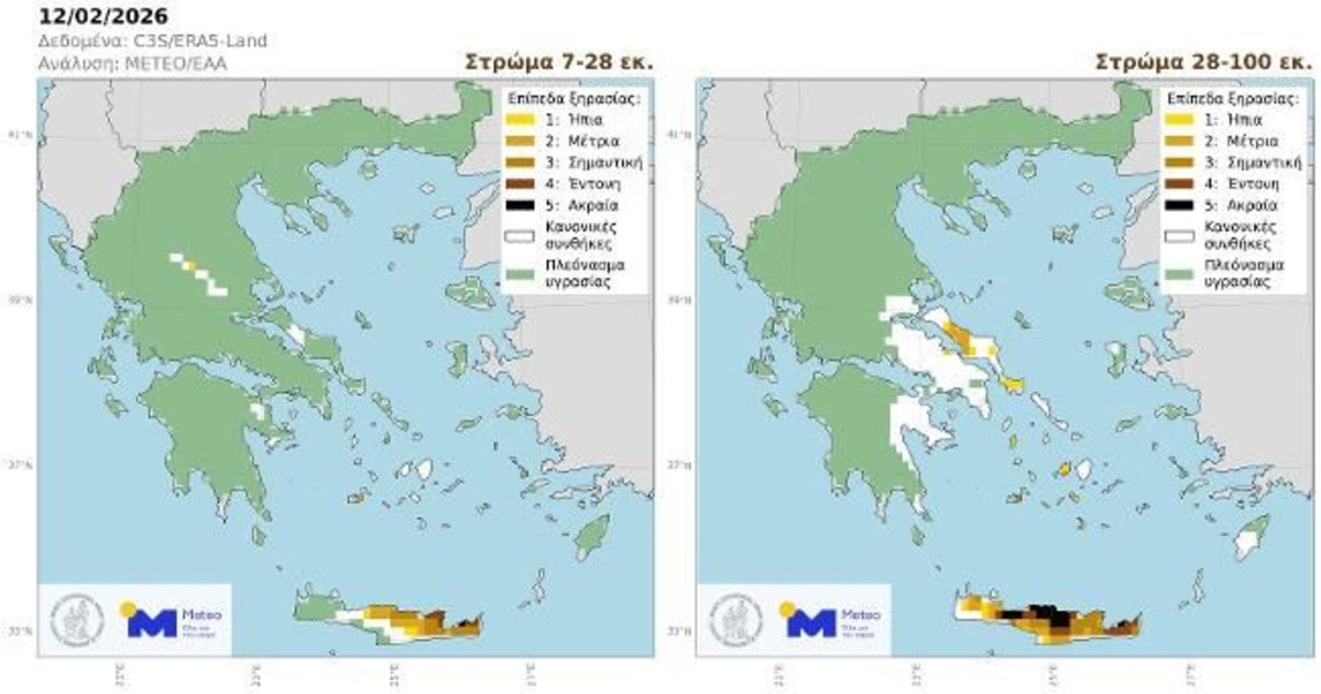 Η ομάδα ΜΕΤΕΟ του Εθνικού Αστεροσκοπείου Αθήνας εξέδωσε δελτίο για τις συνθήκες ξηρασίας στην Ελλάδα στις 12η Φεβρουαρίου 2026. Η ανάλυση βασίζεται στην απόκλιση της υγρασίας των στρωμάτων υπεδάφους από τα κανονικά για την εποχή επίπεδα σε δύο στρώματα: