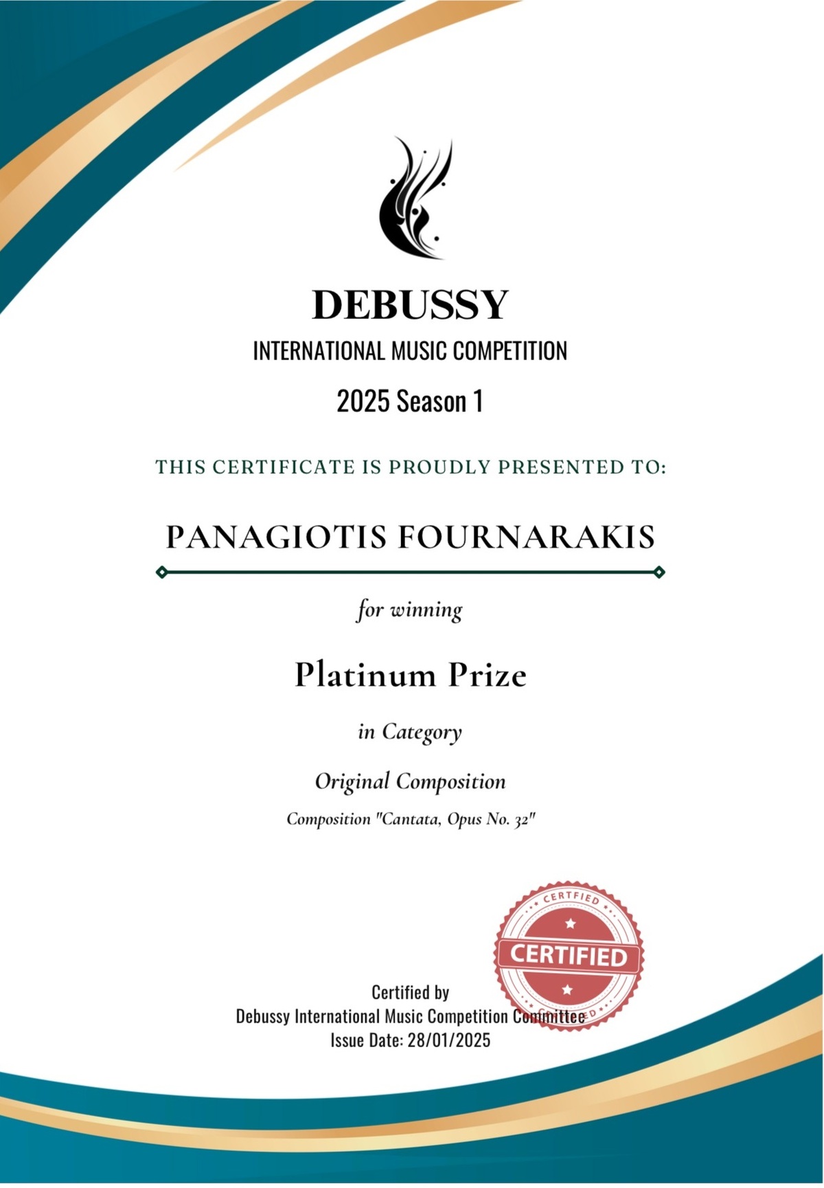 Μετά το 1ο βραβείο που κατέκτησε στο διεθνή διαγωνισμό σύνθεσης “Classical Music Stars International Competition” που διεξήχθη στο Gdansk της Πολωνίας ήρθε μία ακόμη μεγάλη βράβευση από τον Διεθνή Μουσικό Διαγωνισμό «Debussy» στον οποίο κατέκτησε το πλατινένιο βραβείο.