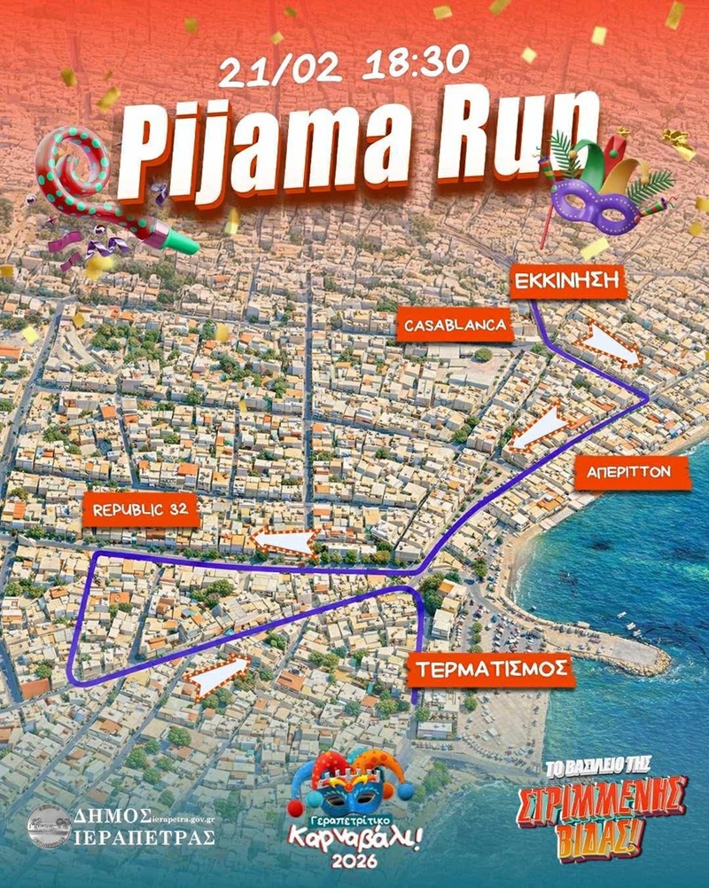 ΙΕΡΑΠΕΤΡΑ 11:43 π.μ. - 17/02/2026 Πιτζαμο-πάρτι στην καρδιά της Ιεράπετρας – Η πόλη γιορτάζει τις Απόκριες με στυλ… ύπνου! ΙΕΡΑΠΕΤΡΑ, ΑΠΟΚΡΙΕΣ Το Σάββατο 21 Φεβρουαρίου στις 18:30 στον πεζόδρομο της Λακέρδα – Δήμος Ιεράπετρας, Νέος Πολιτιστικός Σύλλογος και Σύλλογος Δρομέων Υγείας δίνουν ραντεβού για μ...
