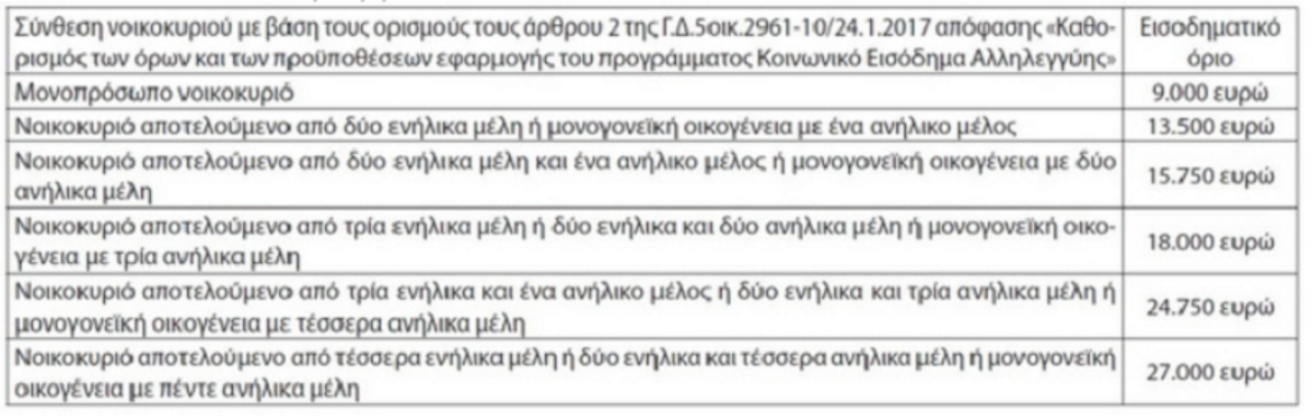 Επιπλέον, για νοικοκυριό που στη σύνθεσή του περιλαμβάνει και άτομο ή άτομα με αναπηρία εξήντα επτά τοις εκατό (67%) και άνω τα παραπάνω εισοδηματικά όρια αυξάνονται κατά οκτώ χιλιάδες (8.000) ευρώ. Για νοικοκυριό που στη σύνθεσή του περιλαμβάνει και άτομο ή άτομα που έχουν ανάγκη μηχανικής υποστήριξης με χρήση ιατρικών συσκευών, η οποία παρέχεται κατ’οίκον και είναι απαραίτητη για τη ζωή τους, τα παραπάνω εισοδηματικά όρια αυξάνονται κατά δεκαπέντε χιλιάδες (15.000) ευρώ. Για κάθε επιπλέον ενήλικο μέλος προστίθεται το ποσό των τεσσάρων χιλιάδων πεντακοσίων (4.500) ευρώ και για κάθε επιπλέον ανήλικο μέλος το ποσό των δύο χιλιάδων διακοσίων πενήντα (2.250) ευρώ, μέχρι του συνολικού ορίου των τριάντα μία χιλιάδων πεντακοσίων (31.500) ευρώ ανεξαρτήτως του αριθμού των μελών του νοικοκυριού. Το ανώτατο όριο του παραπάνω εδαφίου αυξάνεται κατά οκτώ χιλιάδες (8.000) ευρώ για νοικοκυριό που στη σύνθεσή του περιλαμβάνει και άτομο ή άτομα με αναπηρία εξήντα επτά τοις εκατό (67%) και άνω και κατά δεκαπέντε χιλιάδες (15.000) ευρώ για νοικοκυριό που στη σύνθεσή του περιλαμβάνει και άτομο ή άτομα που έχουν ανάγκη μηχανικής υποστήριξης με χρήση ιατρικών συσκευών, η οποία παρέχεται κατ’ οίκον και είναι απαραίτητη για τη ζωή τους.