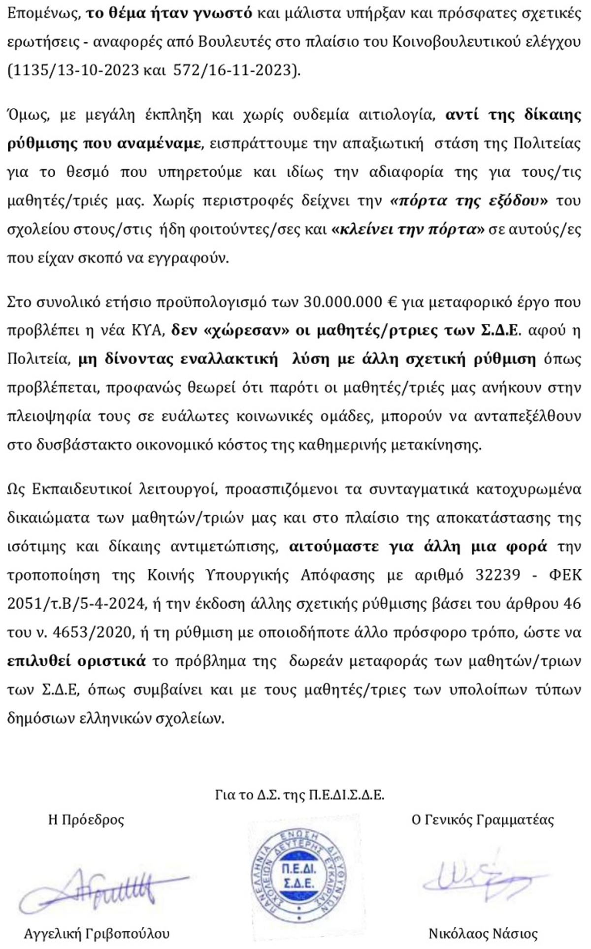 Διαμαρτυρία για τον αποκλεισμό μαθητών των Σχολείων Δεύτερης Ευκαιρίας από τη δωρεάν μεταφορά ΕΝΟΤΗΤΕΣ ΚΟΙΝΩΝΙΑ 10:23 π.μ. - Πέμπτη 18 Απριλίου 2024 10:04 π.μ. - Πέμ, 18/23/2024 ΣΔΕ, ΜΕΤΑΦΟΡΑ ΜΑΘΗΤΩΝ Το ΔΣ του Π.Ε.ΔΙ.Σ.Δ.Ε. ζητά την τροποποίηση της Κοινής Υπουργικής Απόφασης
