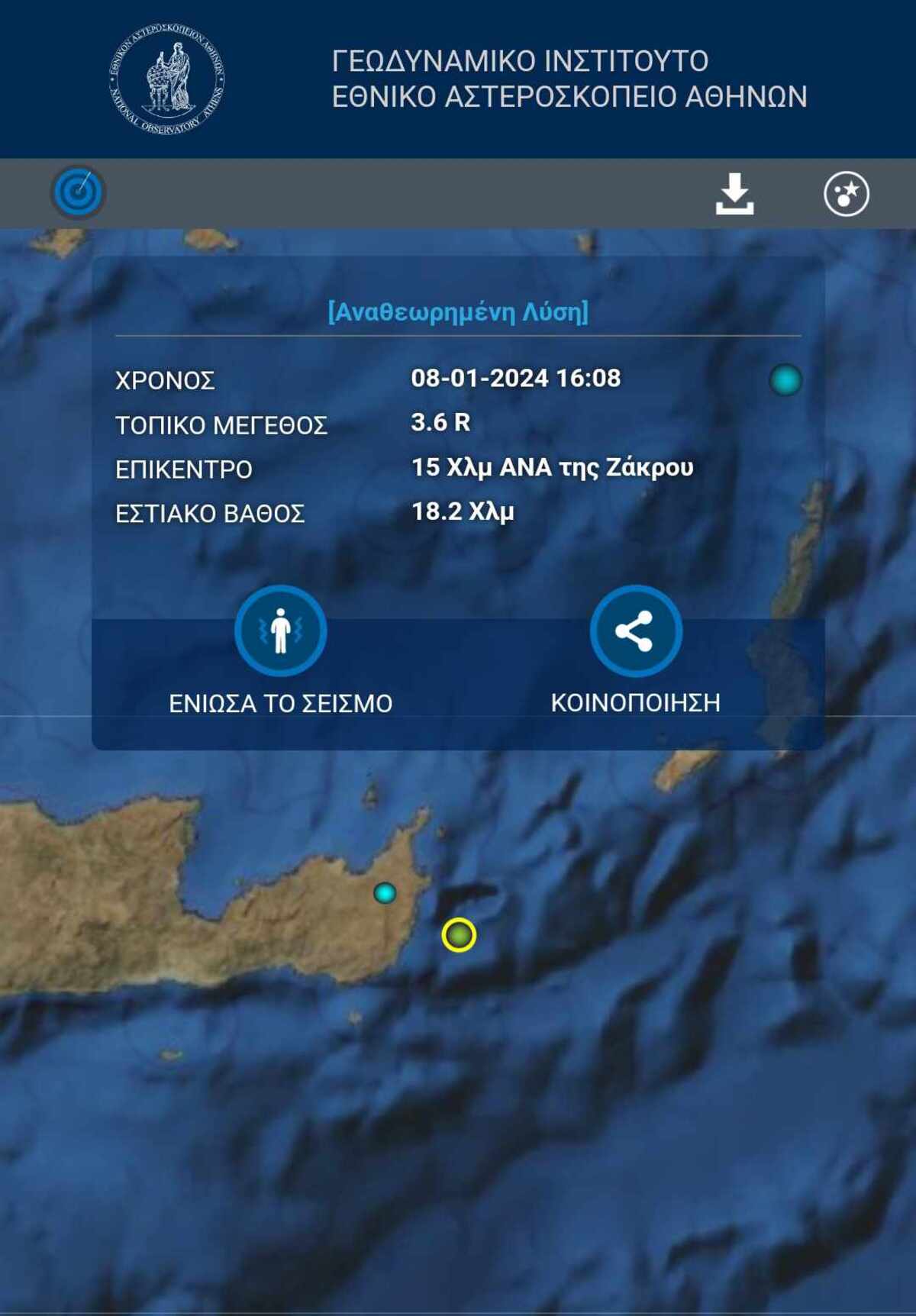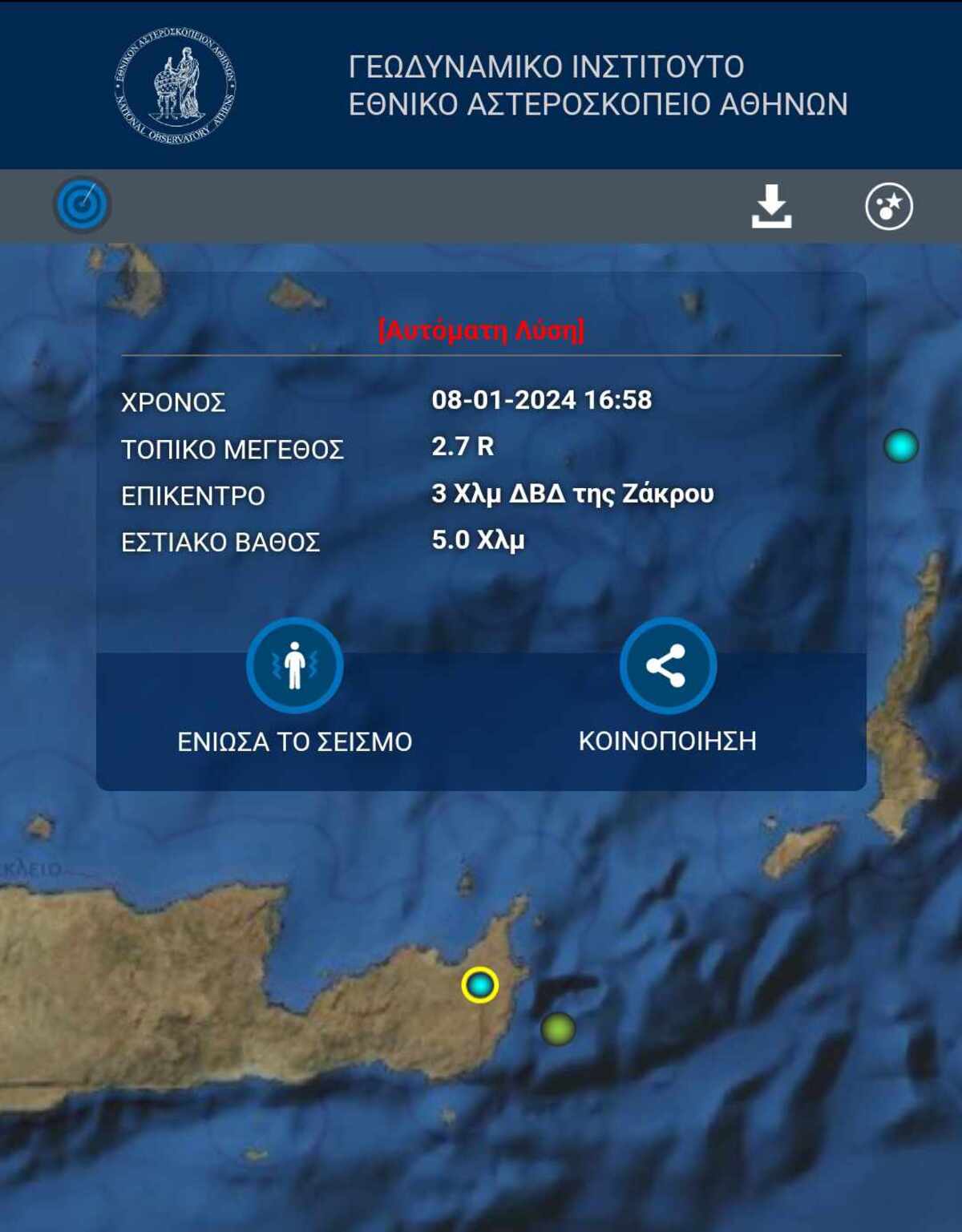 Διπλός σεισμός με διαφορά περίπου τρία τέταρτα ο πρώτος από τον δεύτερο, σημειώθηκε νωρίτερα το απόγευμα της Δευτέρας 08/01/2024 στην Zάκρο .