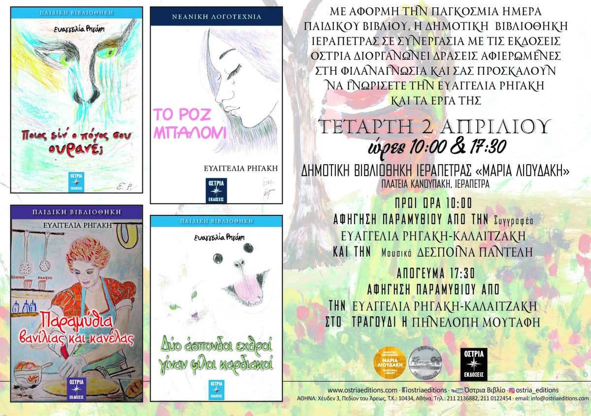 Με αφορμή την Παγκόσμια Ημέρα Παιδικού Βιβλίου, ο Δήμος Ιεράπετρας, η Δημοτική Βιβλιοθήκη σε συνεργασία με τις εκδόσεις ΟΣΤΡΙΑ διοργανώνει δράσεις αφιερωμένες στη φιλαναγνωσία και σας προσκαλούν να γνωρίσετε την Ευαγγελία Ρηγάκη και τα έργα της.