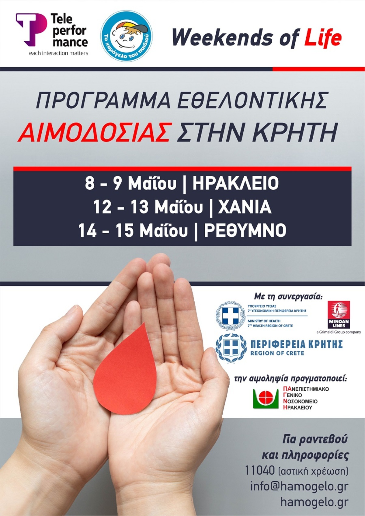 Το Ηράκλειο αποτελεί τον πρώτο από τους συνολικά τρεις σταθμούς που θα έχει στην Κρήτη ο κύκλος δράσεων εθελοντικής αιμοδοσίας με τίτλο “Weekends of Life” που διοργανώνει ο Οργανισμός «Το Χαμόγελο του Παιδιού» σε συνεργασία με το Υπουργείο Υγείας, με την πολύτιμη υποστήριξη και συνεργασία της Teleperformance Greece, την κορυφαία εταιρεία τηλεφωνικής και διαδικτυακής υποστήριξης και εξυπηρέτησης πελατών στην Ελλάδα, με στόχο την άμεση ενίσχυση των παιδιών και των ενηλίκων που έχουν ανάγκη για αίμα. Ακολουθούν τα Χανιά την Τετάρτη 12 και την Πέμπτη 13 Μαΐου, καθώς επίσης το Ρέθυμνο την Παρασκευή 14 και το Σάββατο 15 Μαΐου 2021.