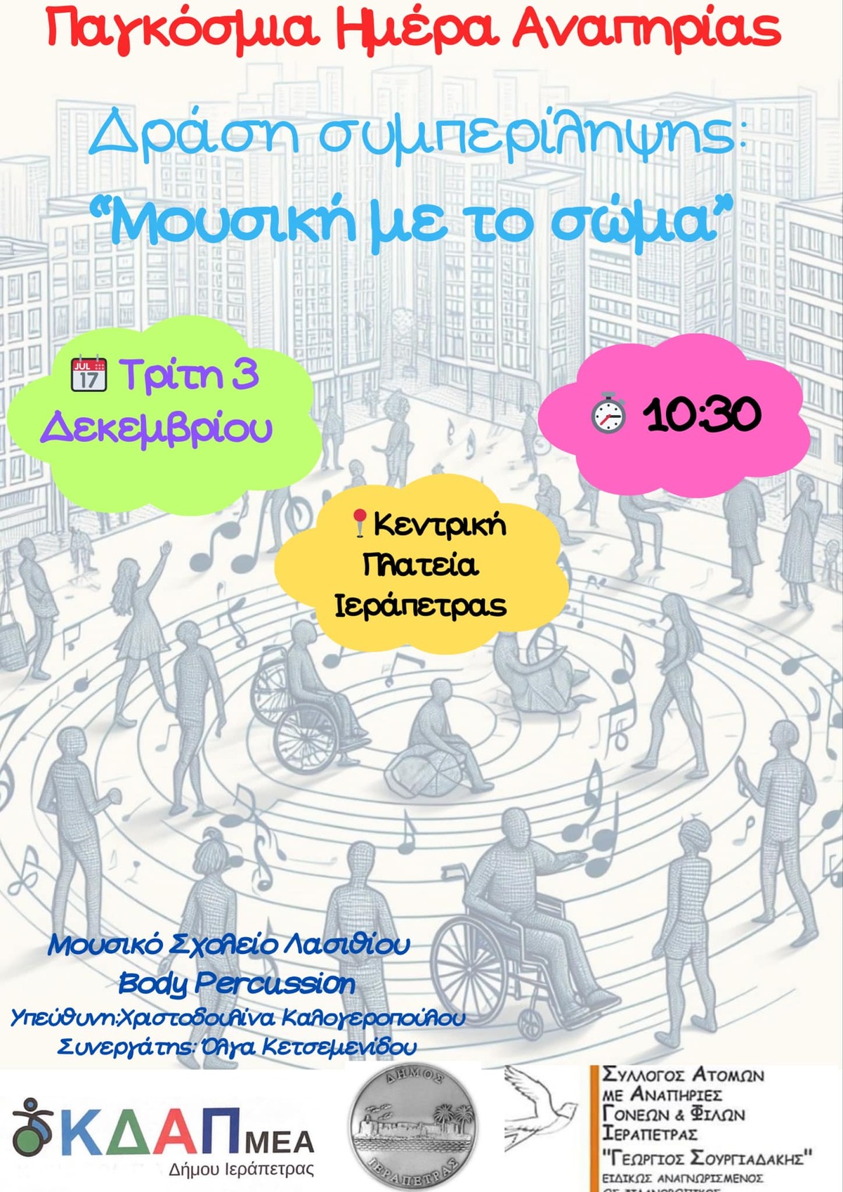 Δράση συμπερίληψης: "Μουσική με το σώμα" από το Μουσικό Γυμνάσιο Λασιθίου ΛΑΣΙΘΙ ΙΕΡΑΠΕΤΡΑ 11:49 π.μ. - Παρασκευή 29 Νοεμβρίου 2024 11:11 π.μ. - Παρ, 29/49/2024 ΙΕΡΑΠΕΤΡΑ, ΜΟΥΣΙΚΟ ΓΥΜΝΑΣΙΟ ΛΑΣΙΘΙΟΥ, ΔΡΑΣΗ ΣΥΜΠΕΡΙΛΗΨΗΣ, ΠΑΓΚΟΣΜΙΑ ΗΜΕΡΑ ΑΝΑΠΗΡΙΑΣ Την Τρίτη 3 Δεκεμβρίου με αφορμή την Παγκόσμια Ημέρα Αναπηρίας