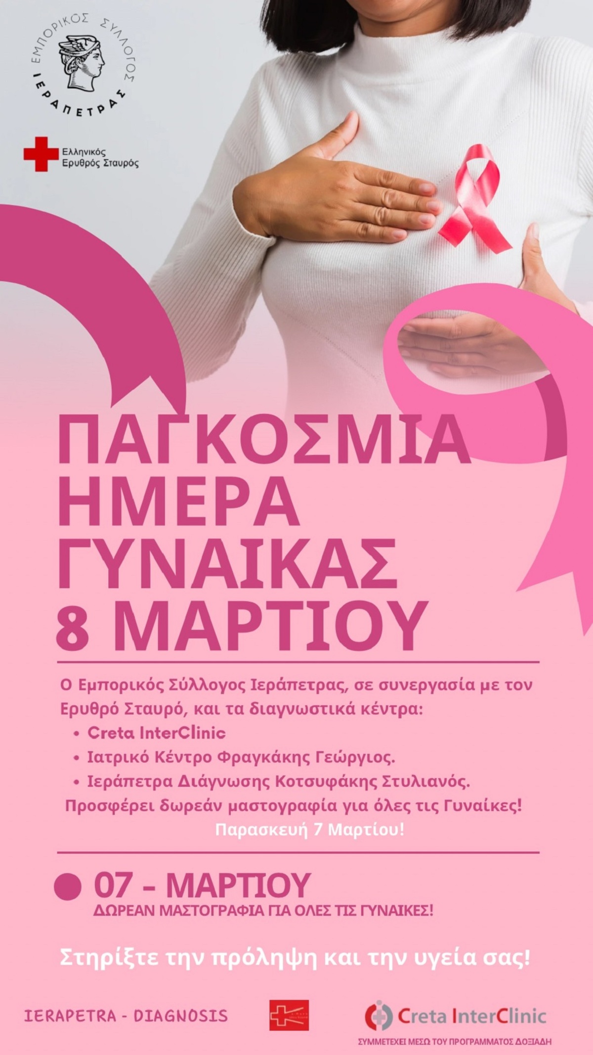 Προσφέρει δωρεάν μαστογραφία για όλες τις γυναίκες, την Παρασκευή 7 Μαρτίου 2025, στα πλαίσια εορτασμού της Παγκόσμιας Ημέρας της Γυναίκας (8/3).