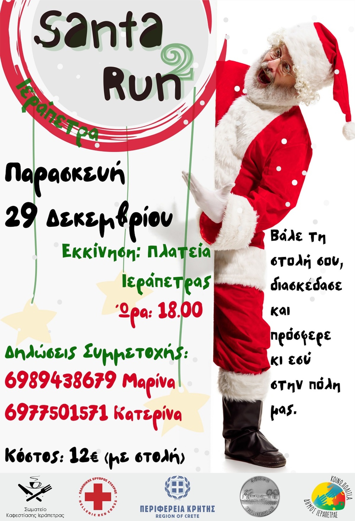 Το Ierapetra Santa - Run διοργανώνεται με την υποστήριξη του Σωματείου καφέ εστίασης Ιεράπετρας, του Περιφερειακού Τμήματος Ελληνικού Ερυθρού Σταυρού Ιεράπετρας, της Περιφέρειας Κρήτης, του Δήμου Ιεράπετρας και της ΚΟΙΝΩ.ΠΟΛΙΤΙ.Ας, στα πλαίσια των εορταστικών εκδηλώσεων της πόλης μας.
