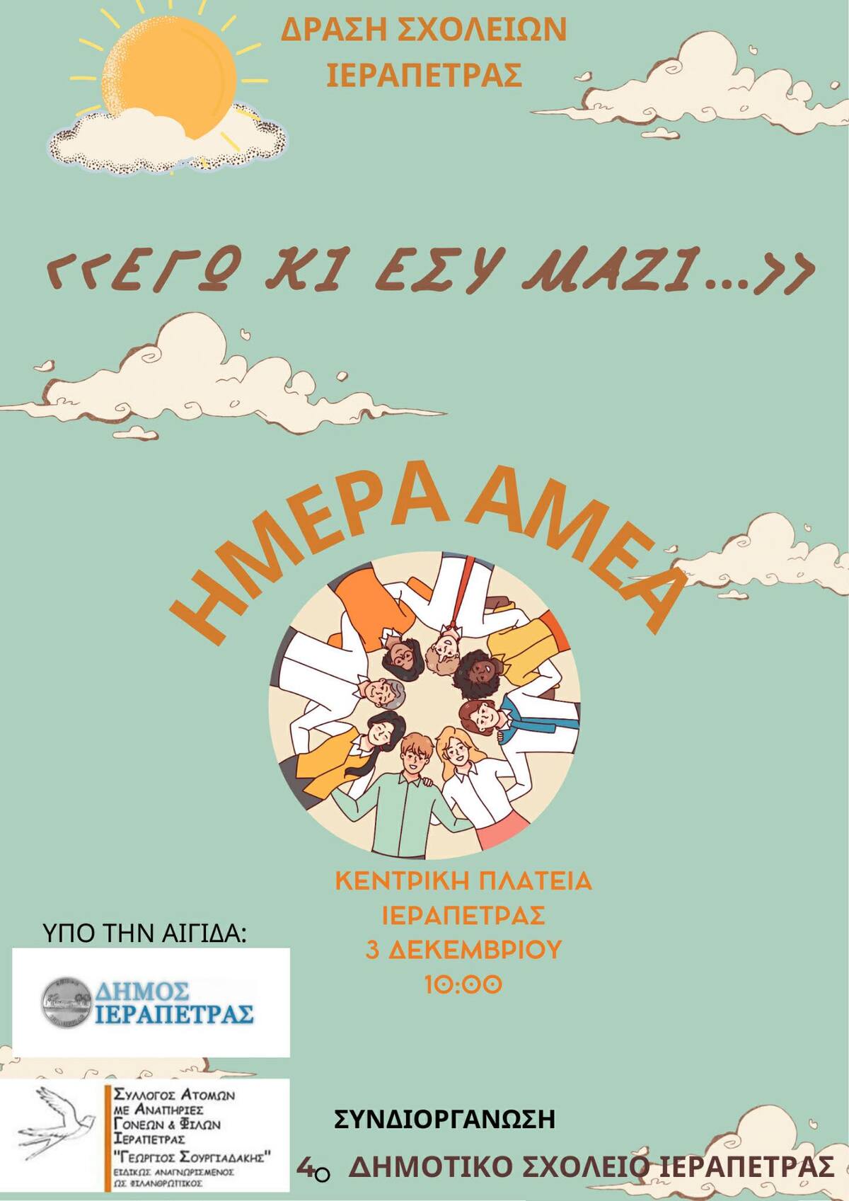 Ο Σύλλογος Ατόμων με Αναπηρίες Γονέων και Φίλων Ιεράπετρας «Γεώργιος Σουργιαδάκης» και το 4ο Δημοτικό Σχολείο διοργανώνουν τη δράση «Εγώ και ‘σύ μαζί με αφορμή τη Παγκόσμια Ημέρα ατόμων με αναπηρία που έχει οριστεί 3 Δεκέμβρη».