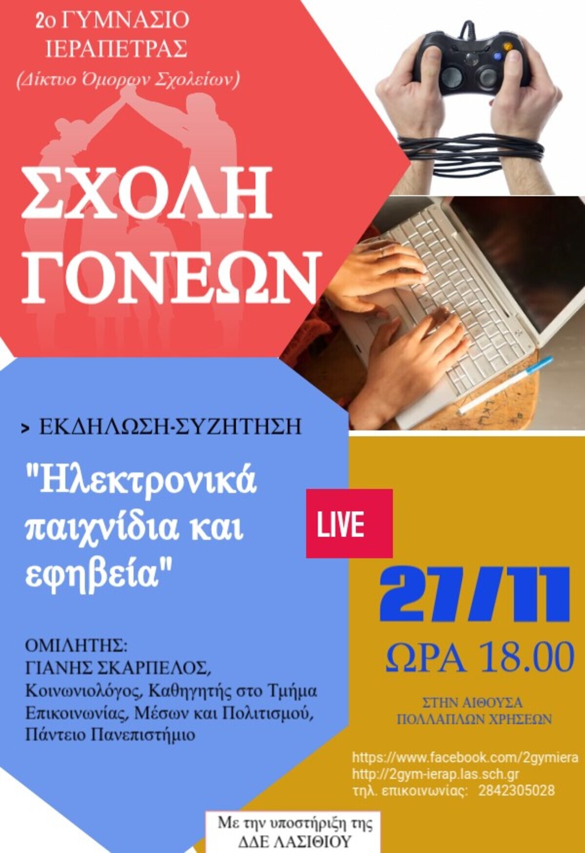 Το 2ο Γυμνάσιο Ιεράπετρας σε συνεργασία με το δίκτυο Όμορων Σχολείων διοργανώνει εκδήλωση-συζήτηση στο πλαίσιο της Σχολής Γονέων με τίτλο: