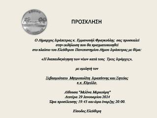 Ο Δήμαρχος Ιεράπετρας κ. Εμμανουήλ Φραγκούλης σας προσκαλεί στην εκδήλωση που θα πραγματοποιηθεί στο πλαίσιο του Ελεύθερου Πανεπιστημίου Δήμου Ιεράπετρας με θέμα: