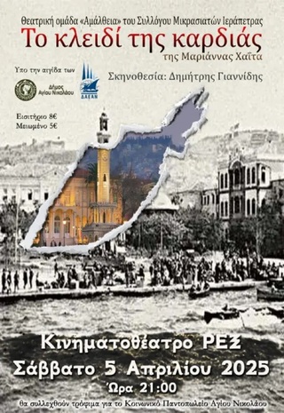 Η θεατρική ομάδα του Συλλόγου Μικρασιατών Ιεράπετρας «Αμάλθεια» παρουσιάζει τη θεατρική παράσταση «Το κλειδί της καρδιάς» σε κείμενα Μαριάννας Χαΐτα και σκηνοθεσία Δημήτρη Γιαννίδη το Σάββατο 5 Απριλίου 2025 στο Κινηματοθέατρο REX στον Άγιο Νικόλαο.