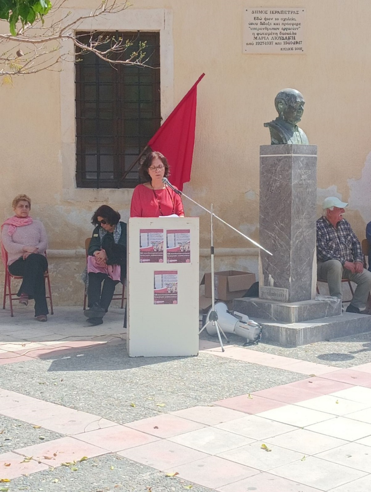 Στη συνέχεια, με αυτοκινητοπομπή μετακινήθηκαν, οι συγκεντρωμένοι στην Πλατεία Παπαγεωργίου στην Ιεράπετρας, όπου πραγματοποιήθήκε η κεντρική ομιλία από την Καράμπελα Σταυρούλα μέλος της ΤΕΛασιθίου του ΚΚΕ, όπου μεταξύ άλλων ειπώθηκε: