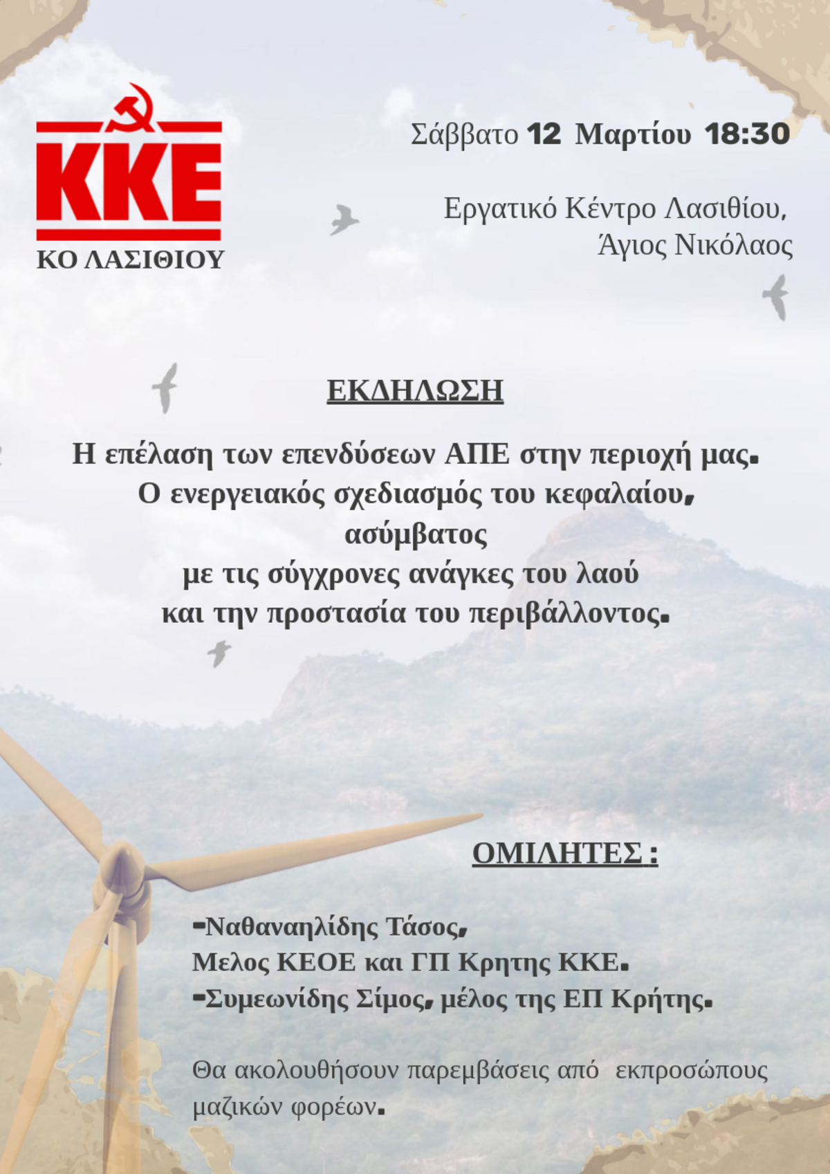 Το Σάββατο 12 Μαρτίου, στις 18:30 στο Εργατικό Κέντρο Λασιθίου στον Άγιο Νικόλαο, με ομιλητές τους: