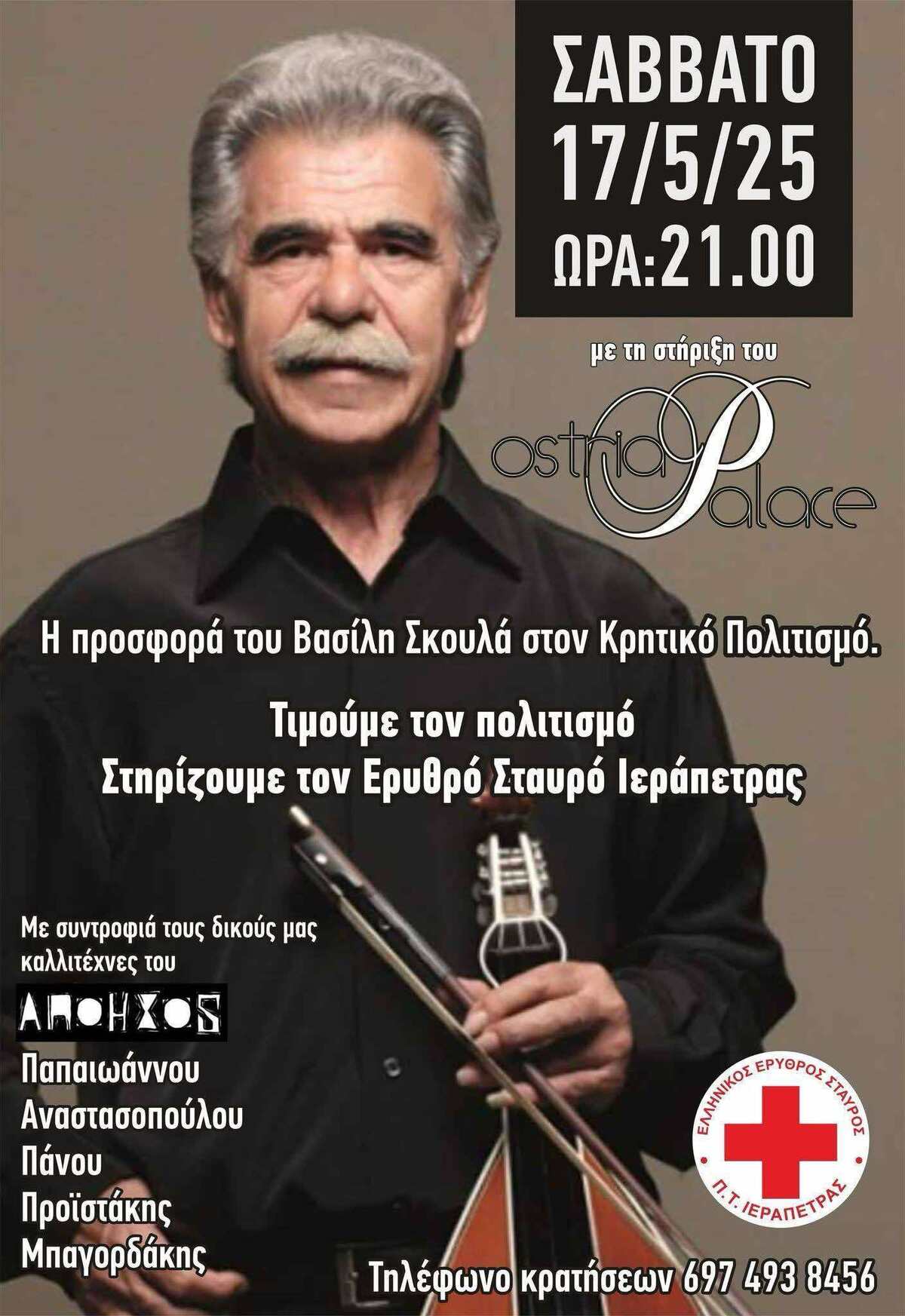 Ο Περιφερειακός Τομέας Ιεράπετρας του Ελληνικού Ερυθρού Σταυρού διοργανώνει μια ξεχωριστή εκδήλωση τιμής και βράβευσης του μεγάλου Κρητικού καλλιτέχνη Βασίλη Σκουλά, για την πολύτιμη και πολυετή προσφορά του στον πολιτισμό της Κρήτης.