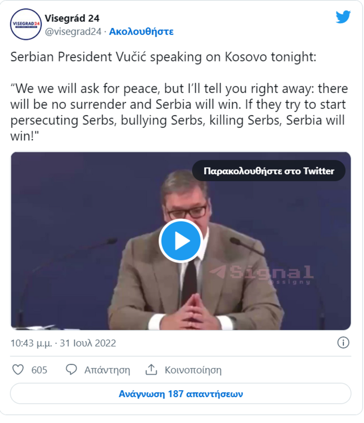 Αυτός είναι και ένας από τους λόγους που κατά τους αναλυτές ο Σέρβος Πρόεδρος έσπευσε χθες να ευχαριστήσει τους Εκπροσώπους του ρωσικού ΥΠΕΞ για τη στάση τους, λέγοντας πως «παρατήρησαν με ακρίβεια τι συμβαίνει και απάντησαν πολύ σωστά», χωρίς όμως να επιθυμεί, όπως φάνηκε, περαιτέρω κλιμάκωση της κατάστασης, δεδομένου ότι κάλεσε δημόσια τη διεθνή κοινότητα να παρέμβει, για να επηρεάσει τους ηγέτες του Κοσόβου στην κατεύθυνση της αποφυγής της έντασης. Στο πλαίσιο αυτό, εκτιμάται ότι ο Αλεξάντερ Βούτσιτς ενεργεί σε διπλό ταμπλό, αποφεύγοντας τη διακοπή των διαύλων επικοινωνίας με τη Δύση και κυρίως με την ΕΕ, ώστε αφενός να πιέζει την Μόσχα υπέρ των δικαιωμάτων των Σέρβων του Κοσόβου, όπως χθες, αλλά και να αποκρούει την εσωτερική πίεση των αντιρωσικών φωνών στο εσωτερικό της Σερβίας, κυρίως όταν αυτές προέρχονται από ισχυρούς οικονομικούς και επιχειρηματικούς κύκλους της χώρας, που επιθυμούν προσέγγιση με την ΕΕ.